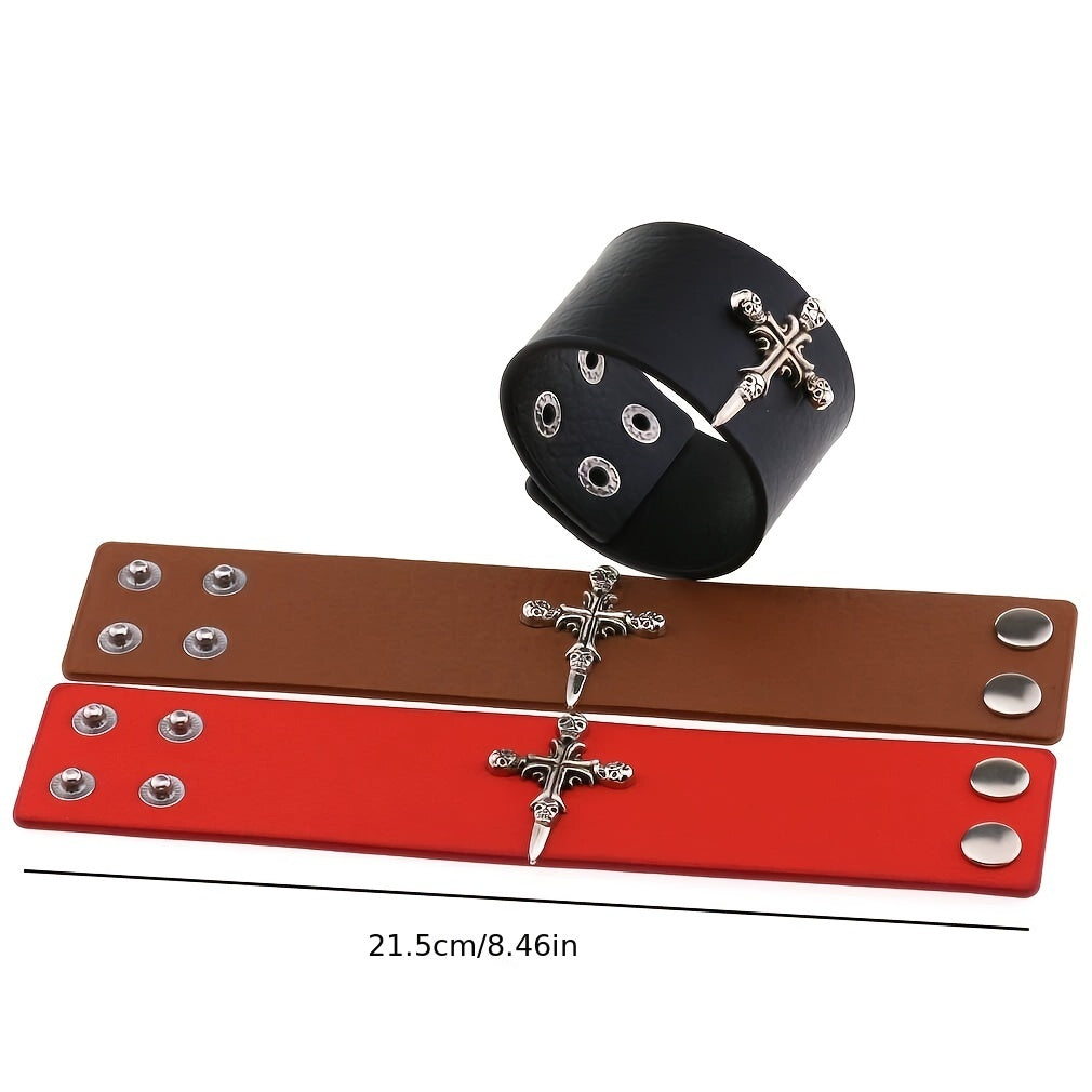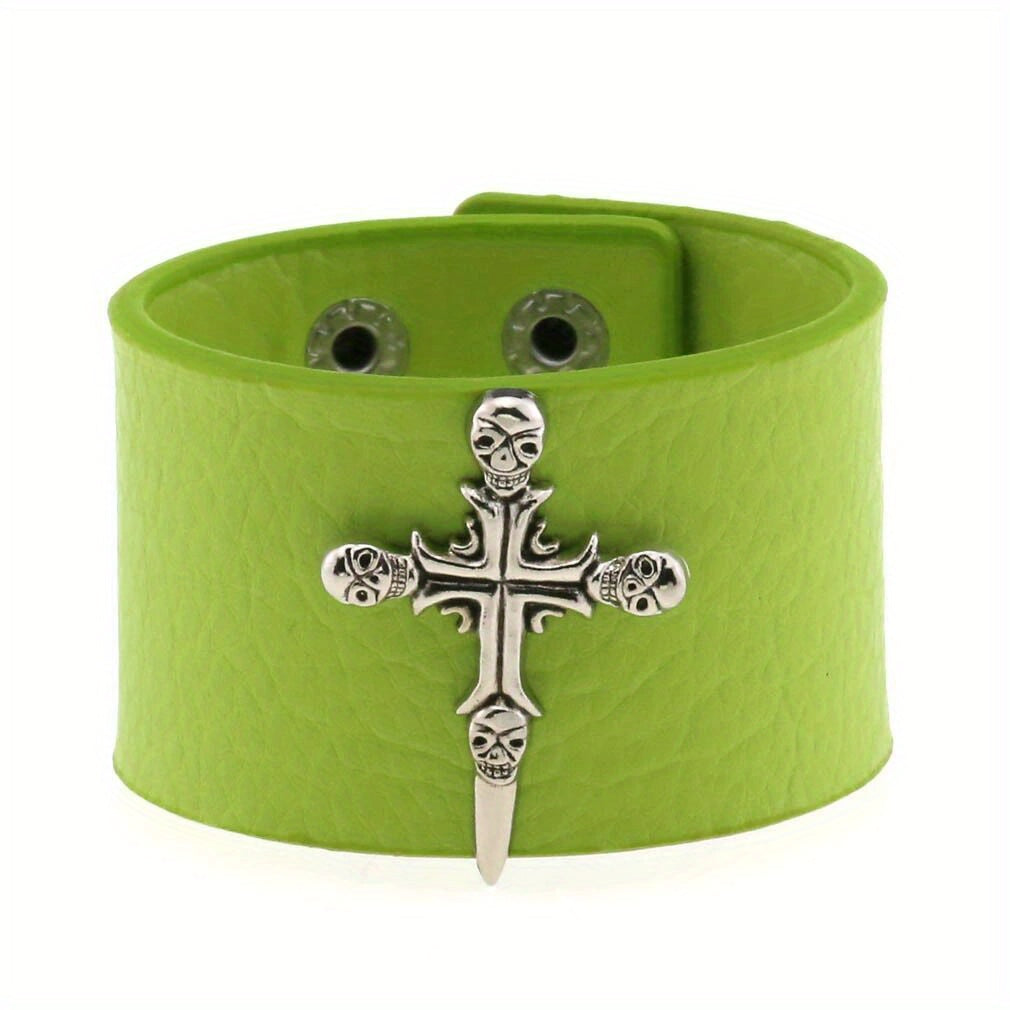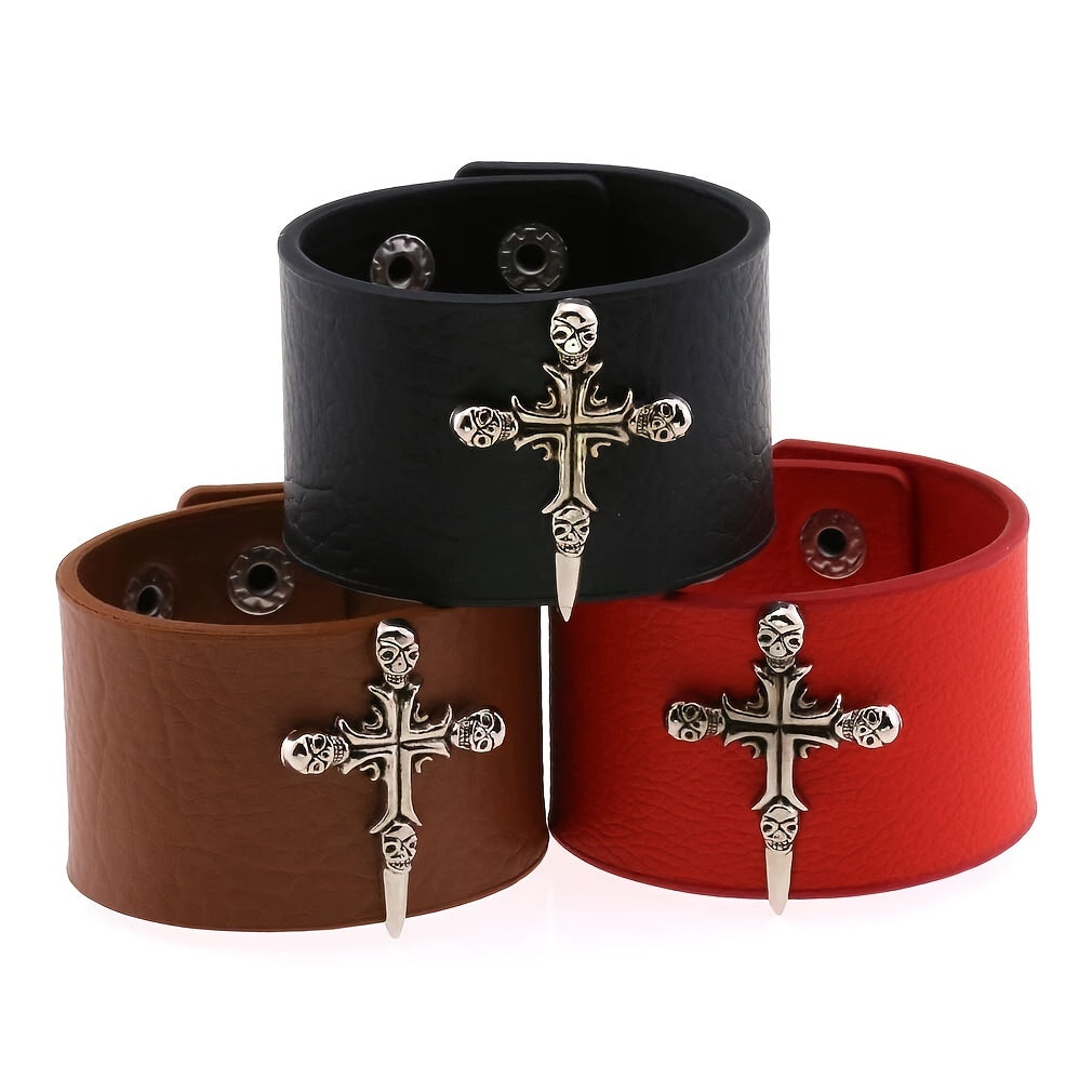 Add a touch of punk gothic style to your outfit with this wide PU leather bracelet featuring a skull head design. Perfect for men who like bold accessories.