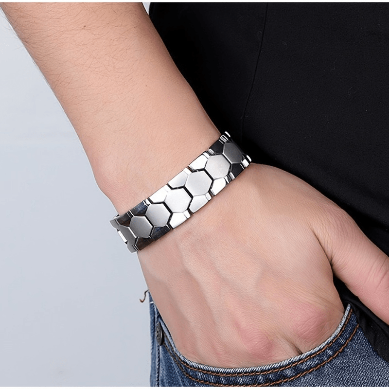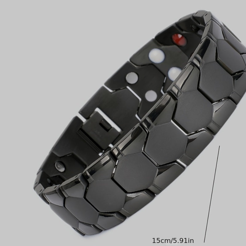This European and American style bracelet features a domineering design with Germanium stone, magnet, and four-in-one elements. It adds a touch of sophistication to your look.