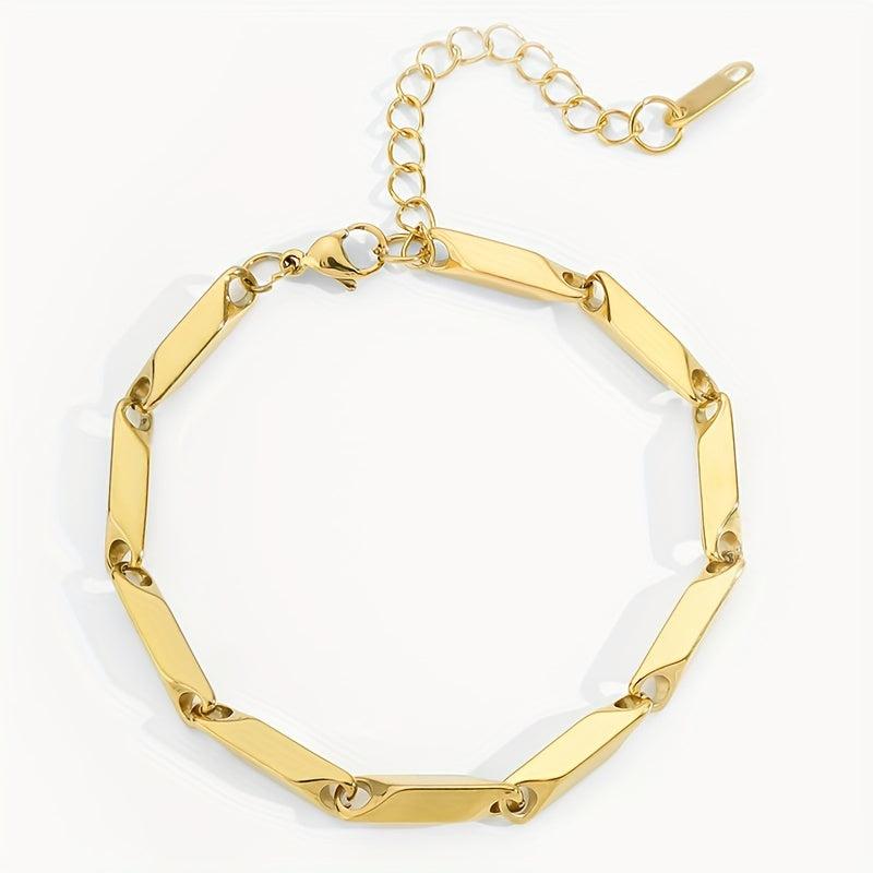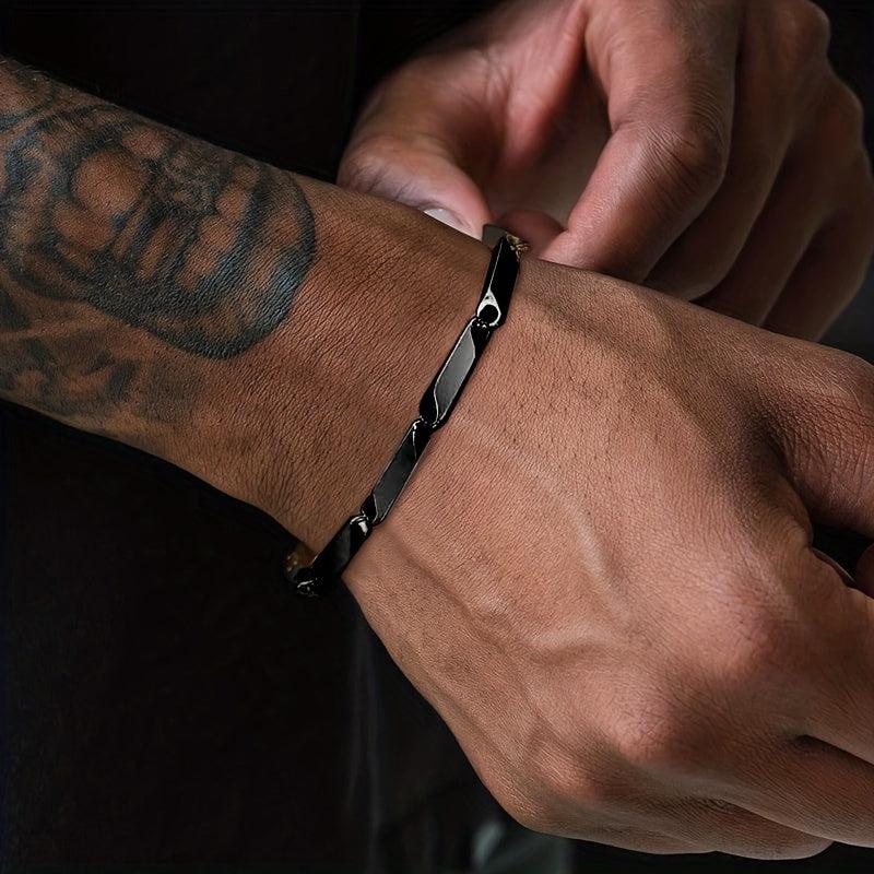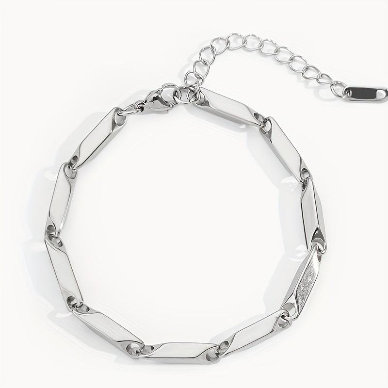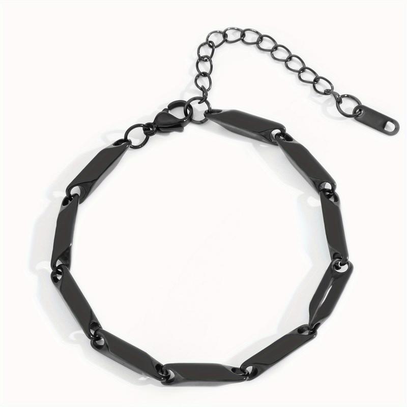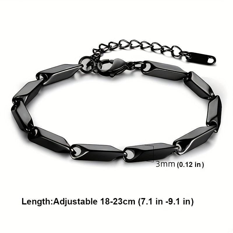 This stylish bracelet is made of titanium steel with a bamboo leaf chain design. It is water resistant and perfect for everyday wear.