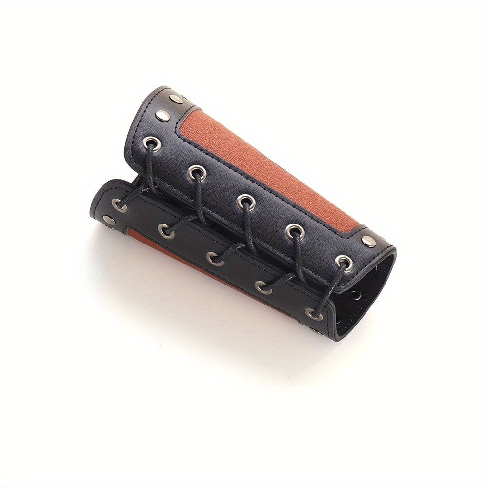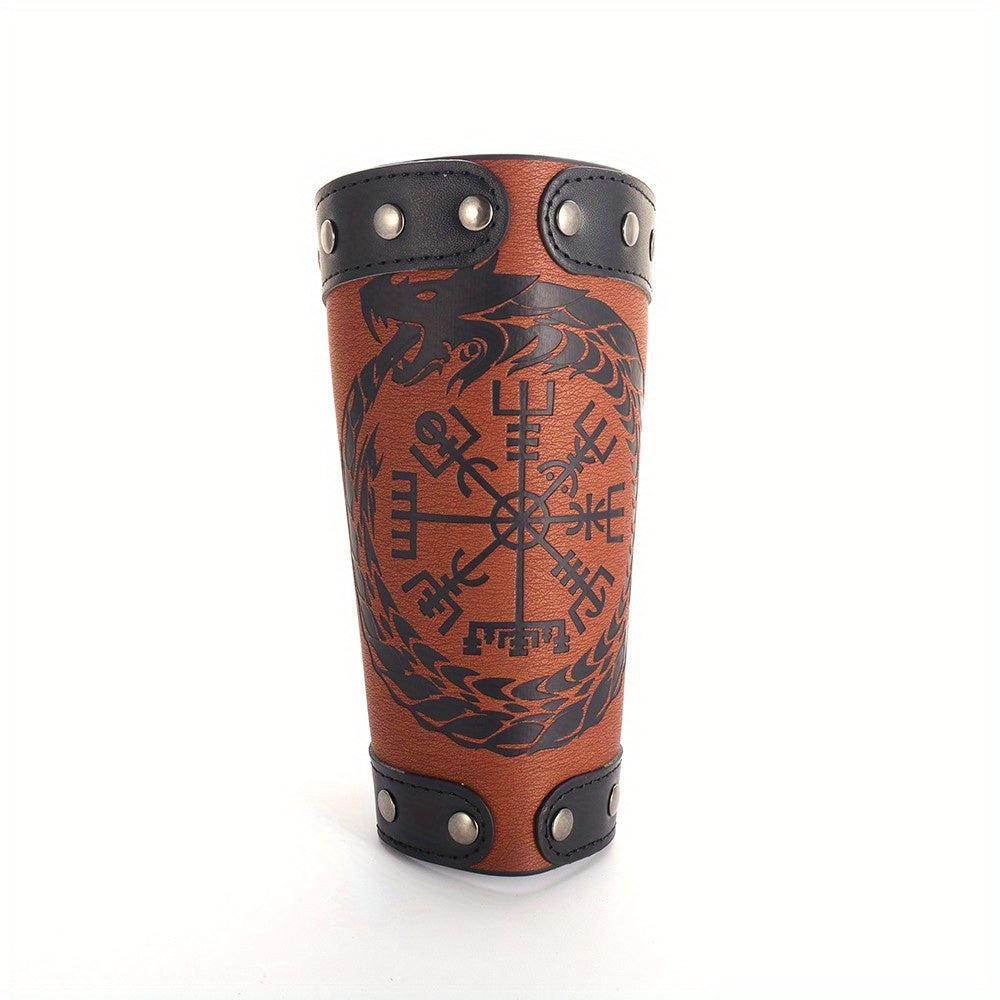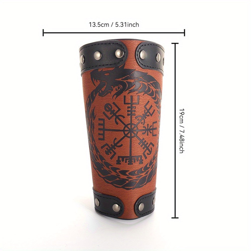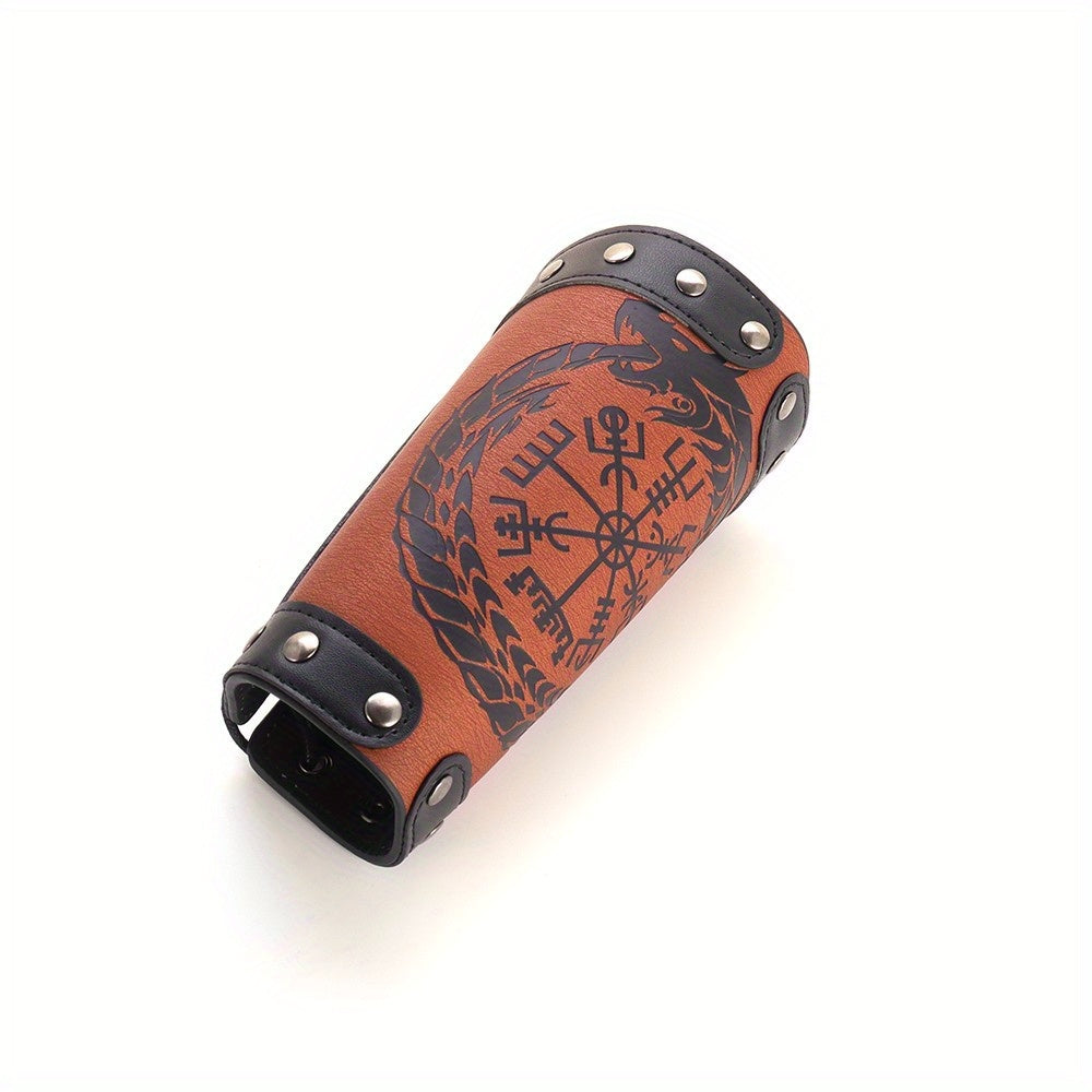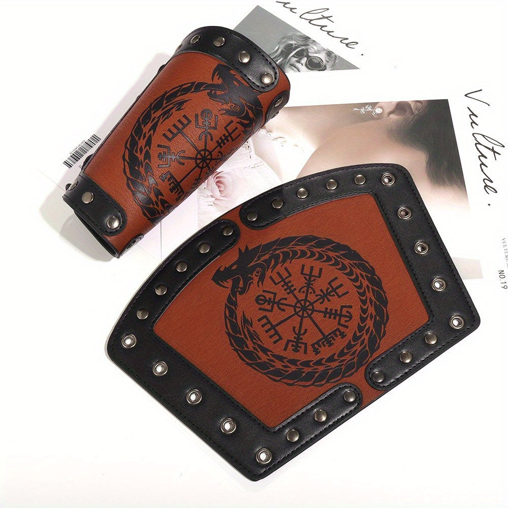This wrist guard is a fashionable and protective accessory for men, featuring a Viking rune dragon totem design in a retro punk style. Made of faux leather, it is a wide cuff that adds a unique touch to any outfit.