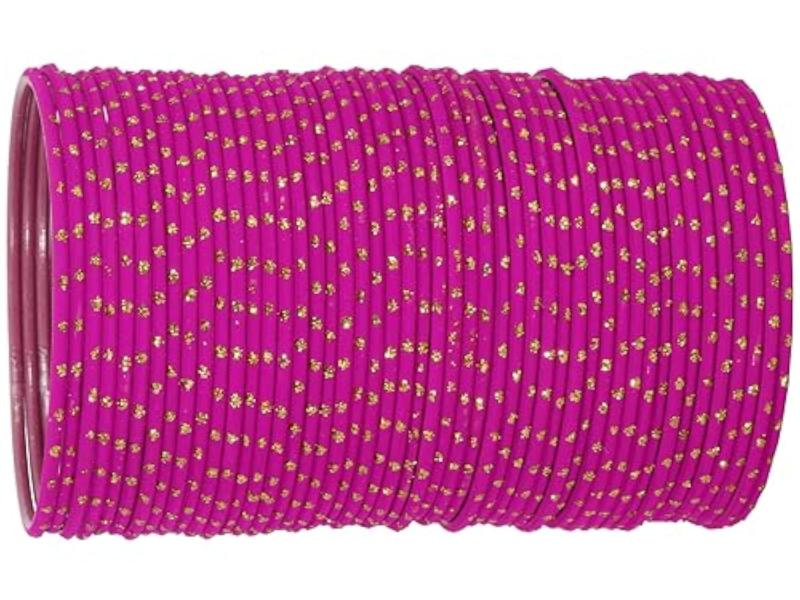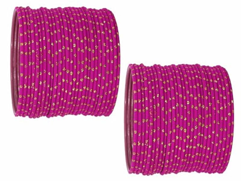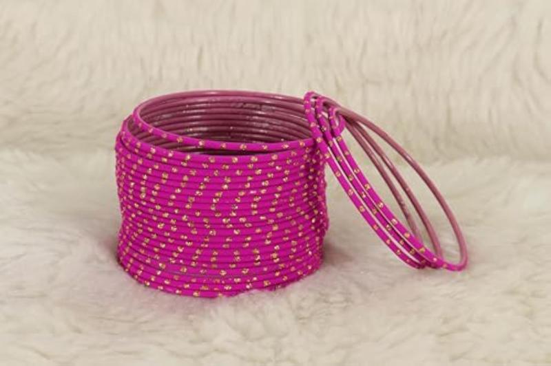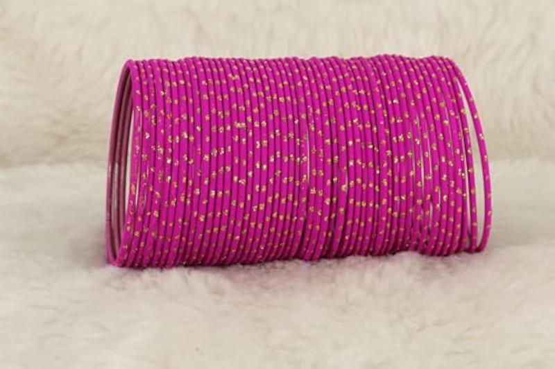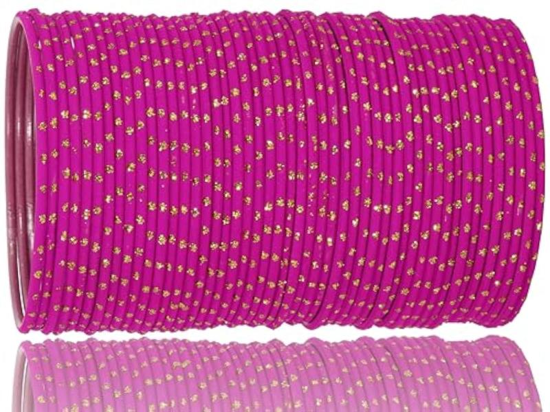 Elevate your ethnic look with this stunning bangles set featuring a mix of metal bangles with golden polka dots and plain chudi bracelet. Perfect for adding a touch of glamour to any outfit.