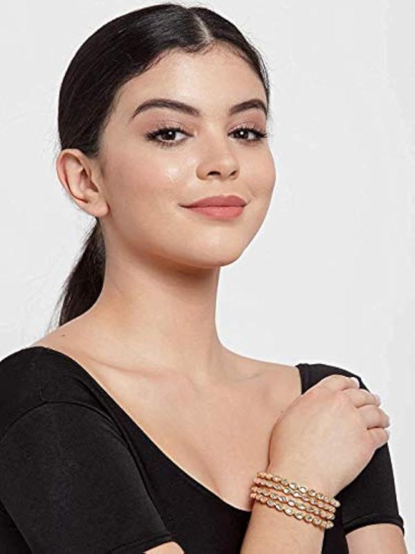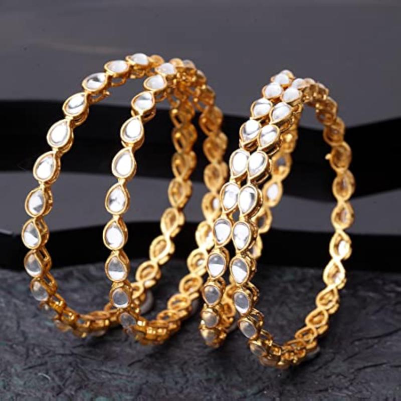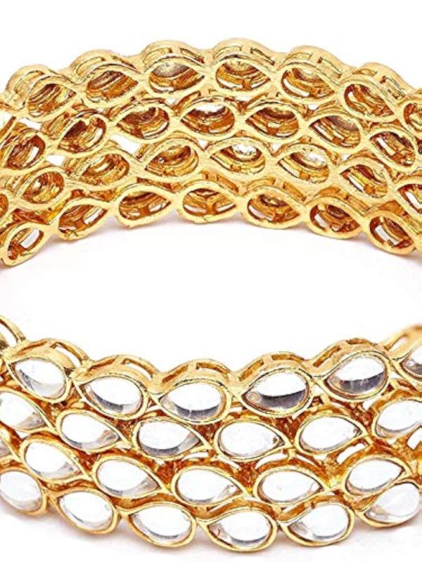 Elegant metal base bangles with cubic zirconia, plated and kundan design. Perfect accessory for traditional occasions.