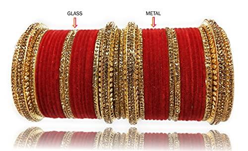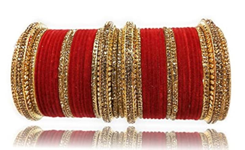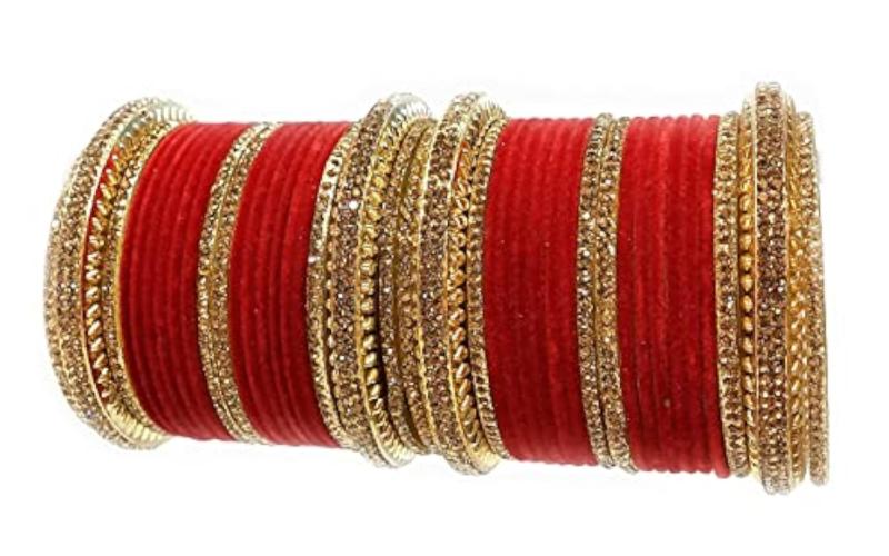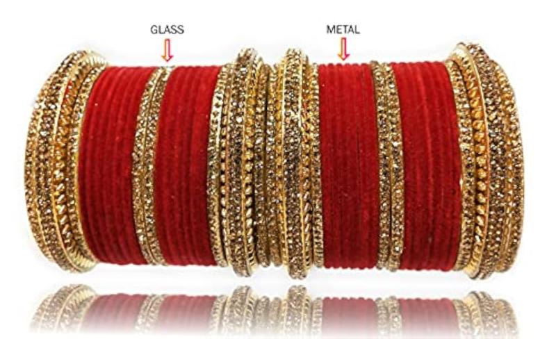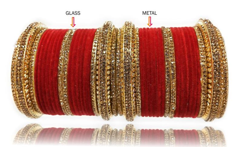 This stunning bangles set features full zircon stones on a metal velvet base, perfect for bridal wear. It adds a touch of elegance and sparkle to your wedding attire.