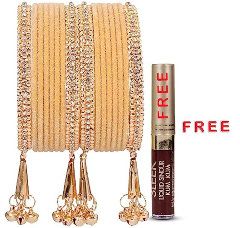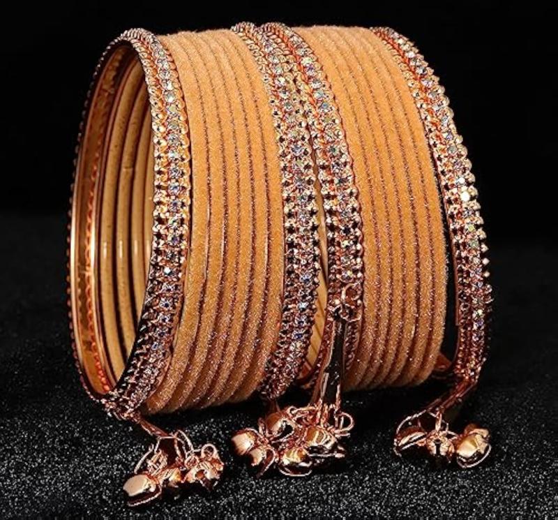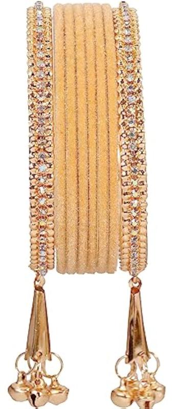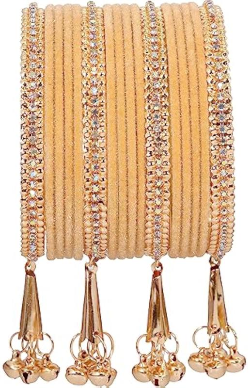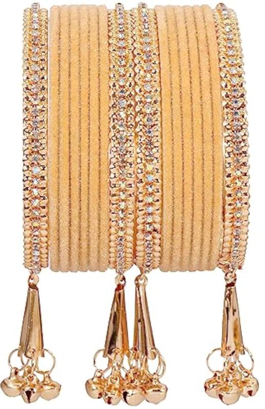 This elegant bangles set features metal with zircon gemstones and velvet studded bells. Perfect for adding a touch of glamour to any outfit.