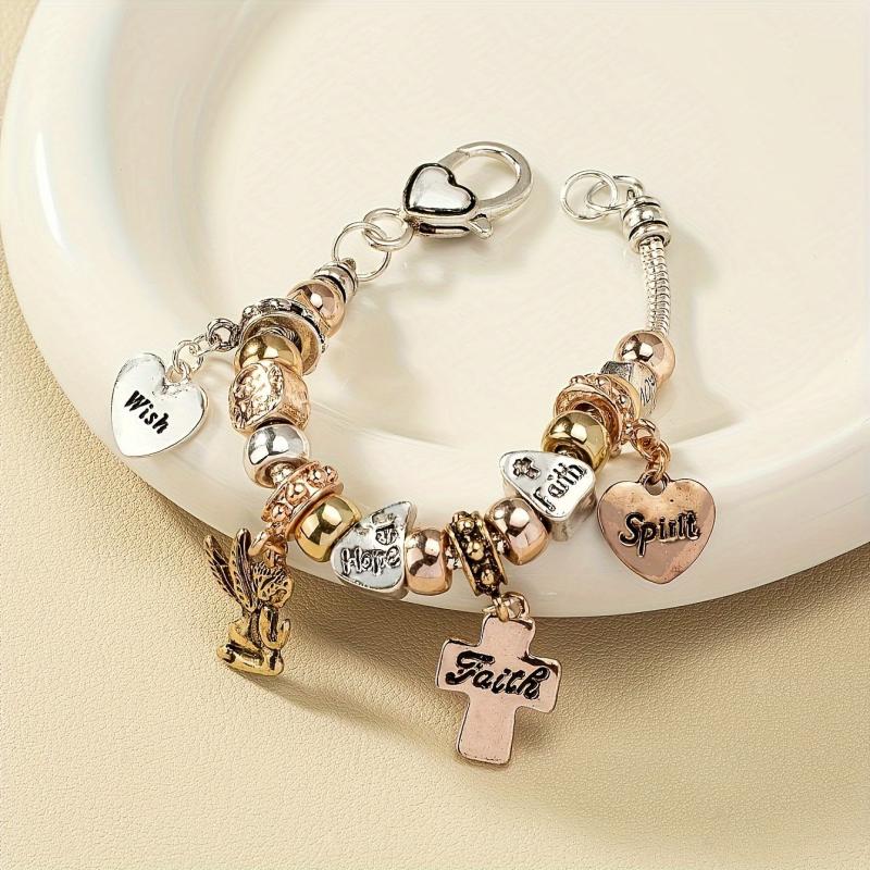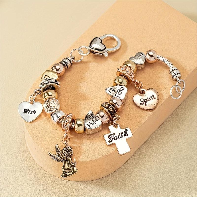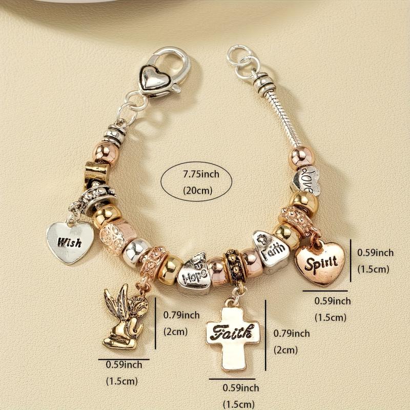 This bracelet features a minimalist design with beautiful charms including a cross, heart, and angel. It is the perfect gift for women who appreciate simple yet meaningful jewelry.
