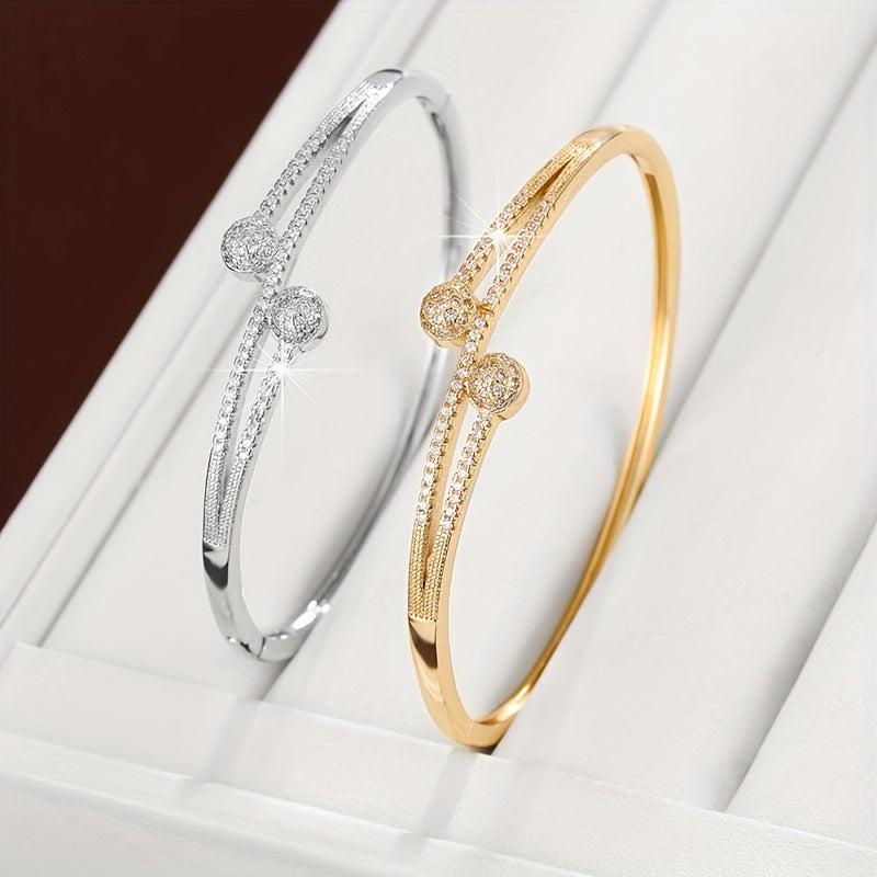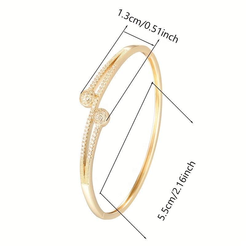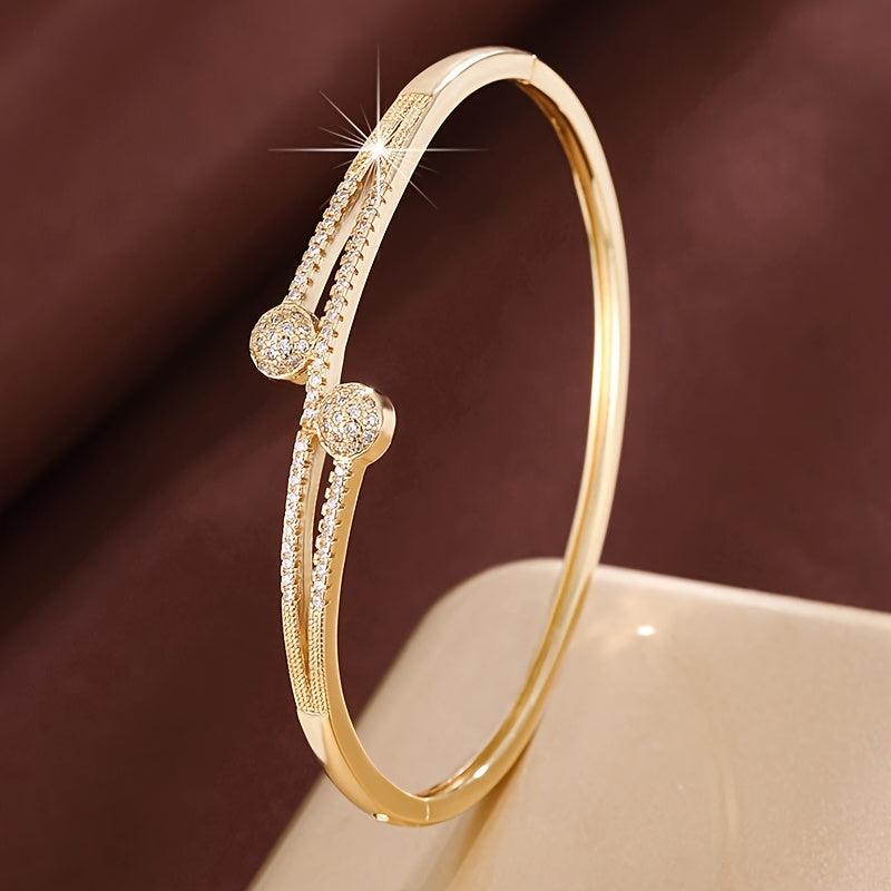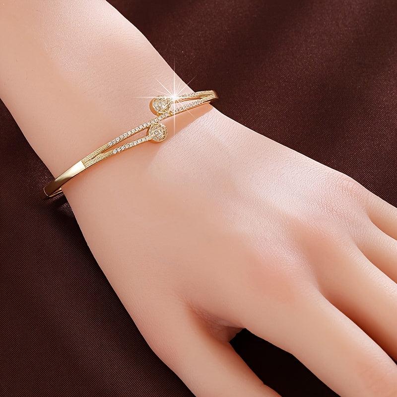 Elegant and charming, this bracelet features synthetic zirconia accents on a golden tone copper plated band. Perfect for daily wear or gifting to a loved one.