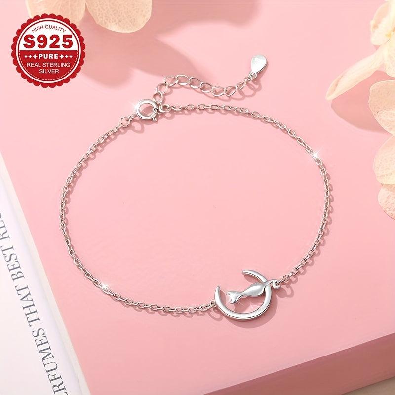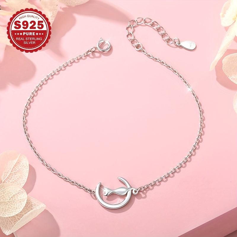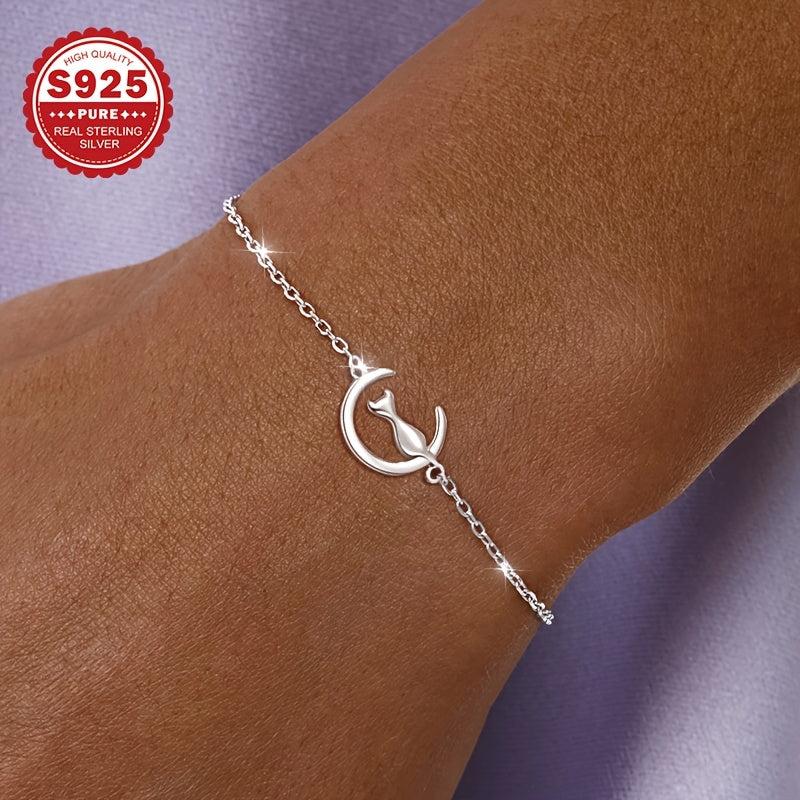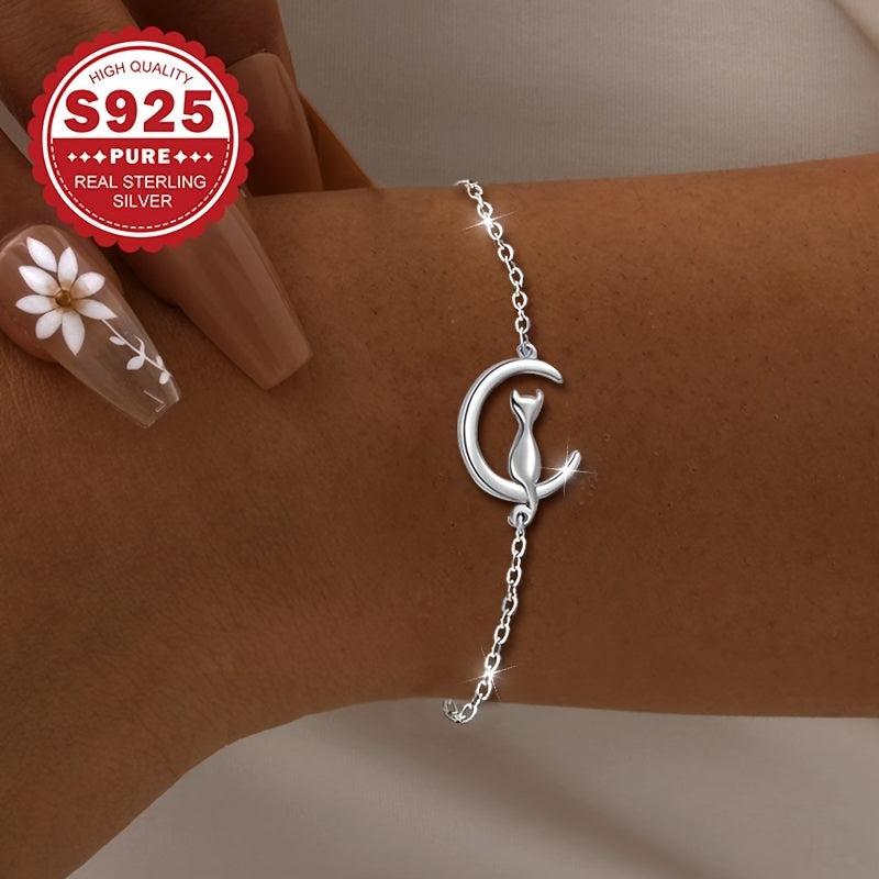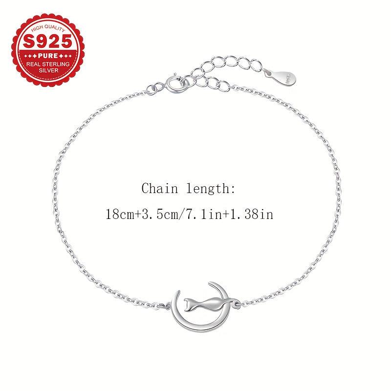 This Moon Cat Bracelet is a unique and elegant piece suitable for daily wear. Crafted from S925 pure silvery material, it's lightweight (1.7g) and low allergy, making it perfect for ladies with sensitive skin.