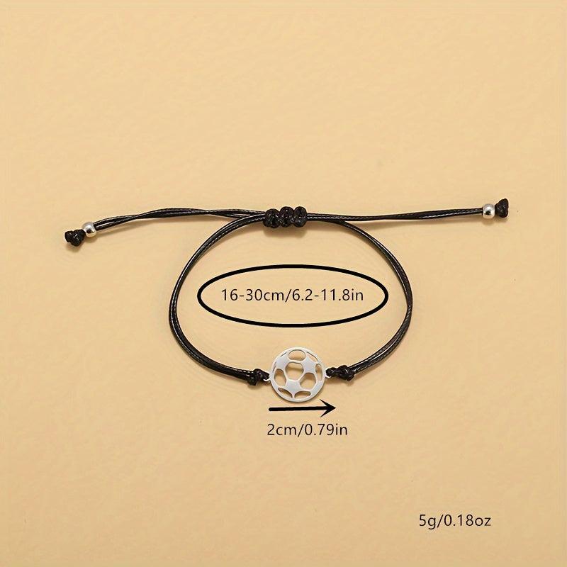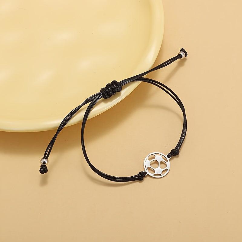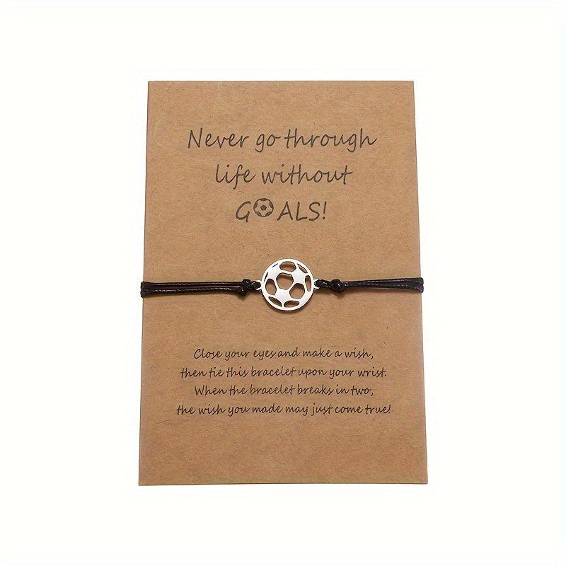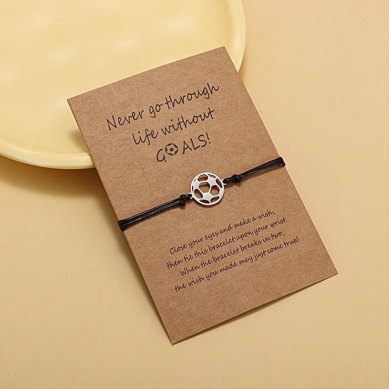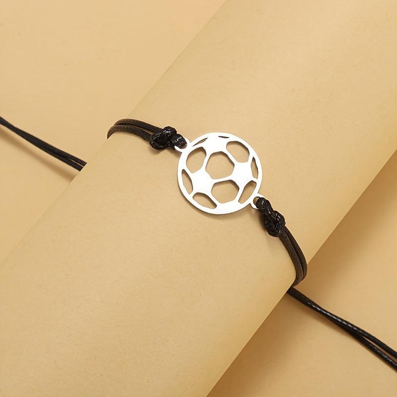 Stainless steel soccer charm bracelet with minimalist cord design and motivational message. Ideal gift for soccer enthusiasts, perfect for daily wear.