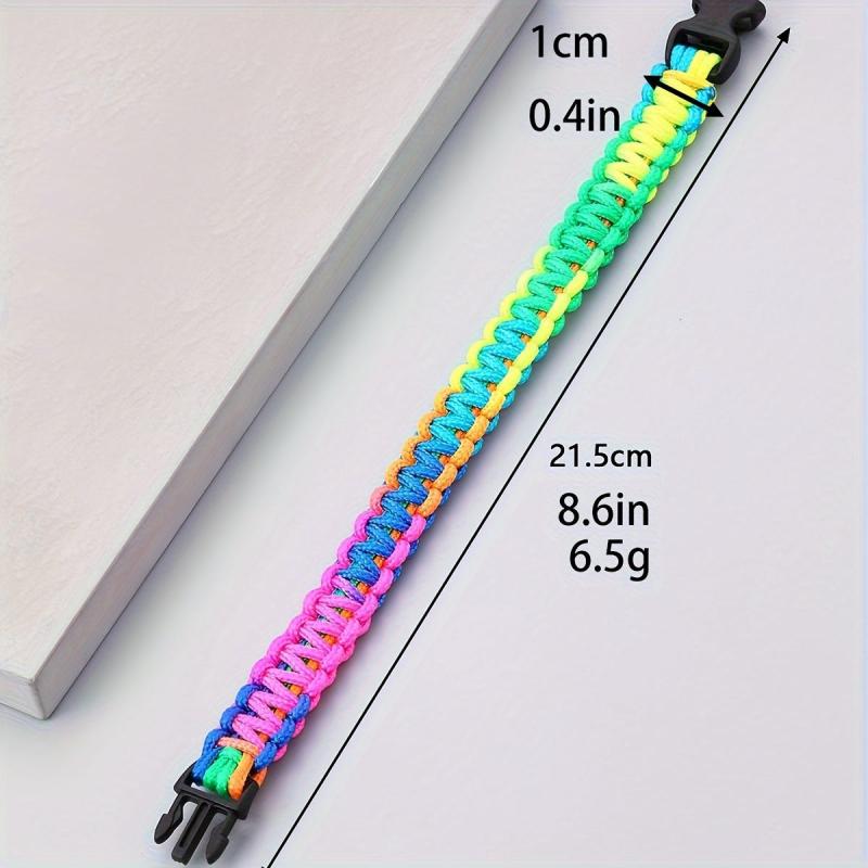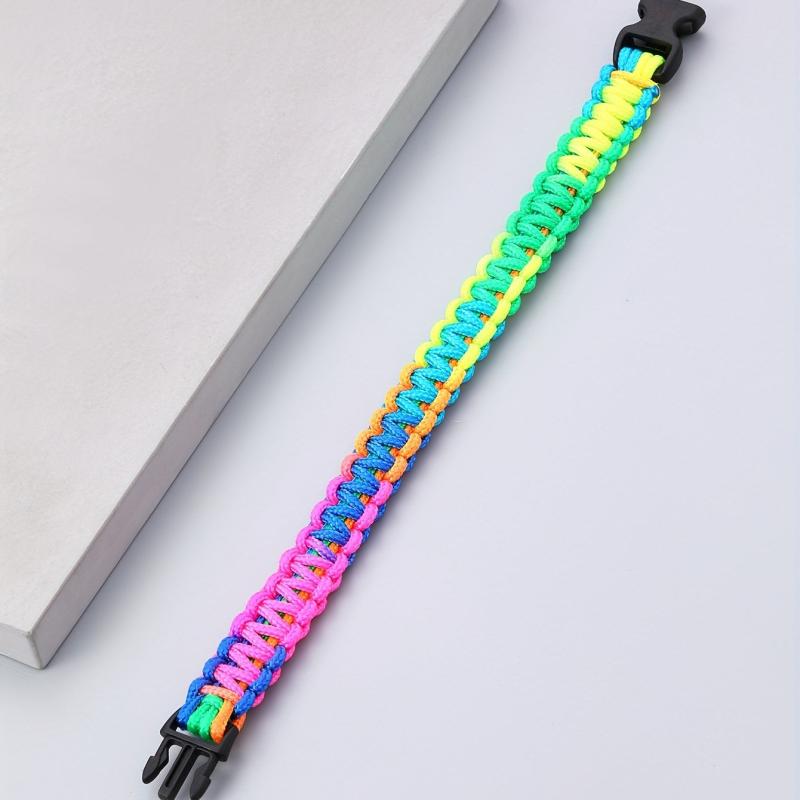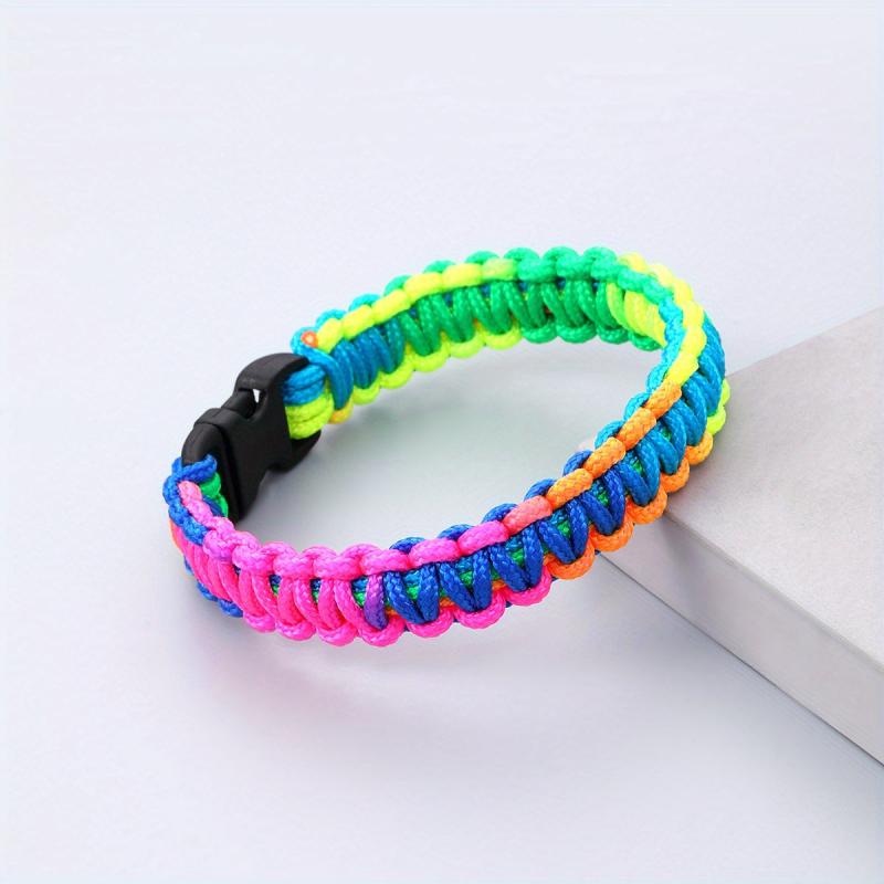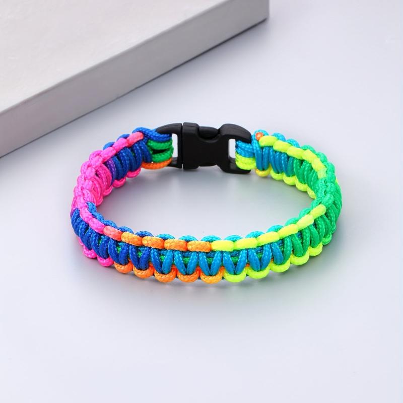 Add a pop of color to your outfit with this vibrant multicolor braided bracelet. The flat knot design and buckle clasp make it a stylish and secure accessory for any occasion.