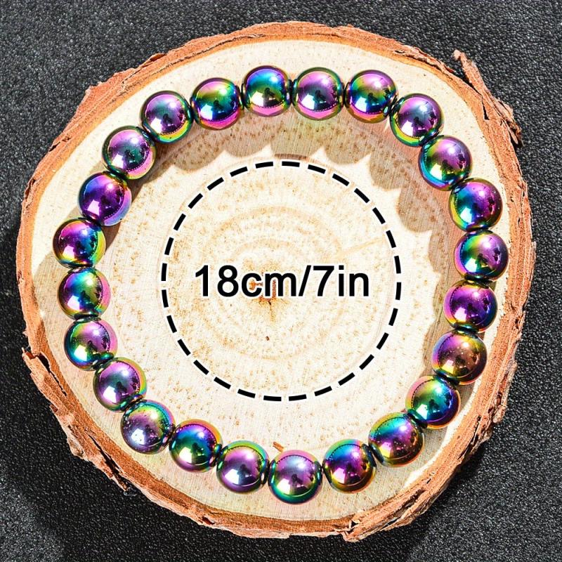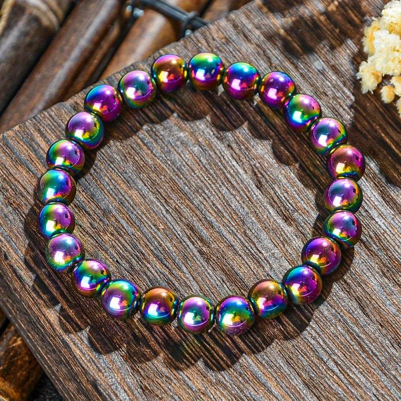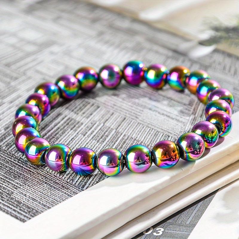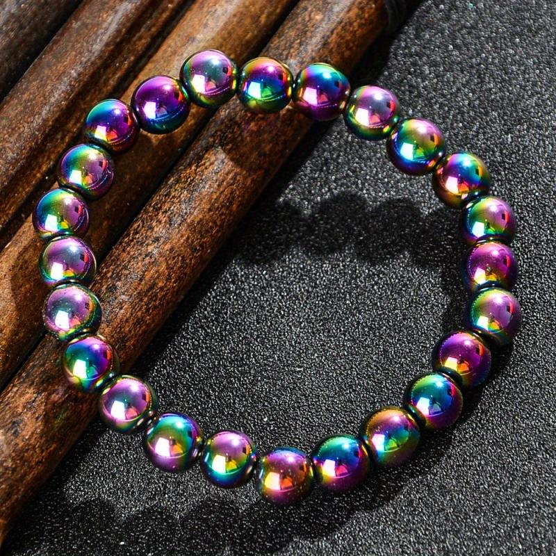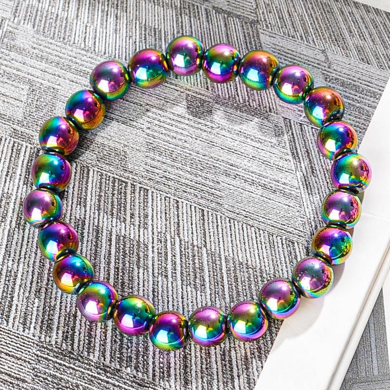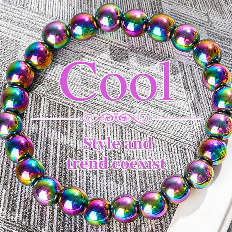 This hip hop bracelet features rainbow iridescent beads that add a playful and smooth touch to your casual attire. It coexists beautifully for men and women alike.