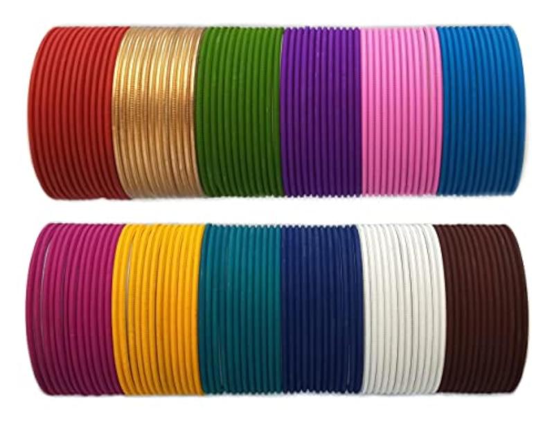 Elevate your traditional look with this set of 144 Nion matte finish metal bangles. Perfect for bridal and festive occasions, these chudiyaan add a touch of elegance to your outfit. Available in 12 colors, these bangles are 2.12 inches in size.