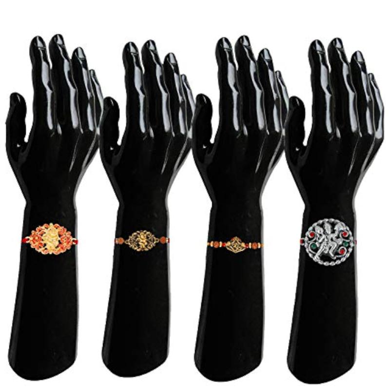 Combo set of beautiful Om, Ganesha, and Hanuman Rakhis embellished with crystals and rudraksha beads, perfect for your beloved brothers.