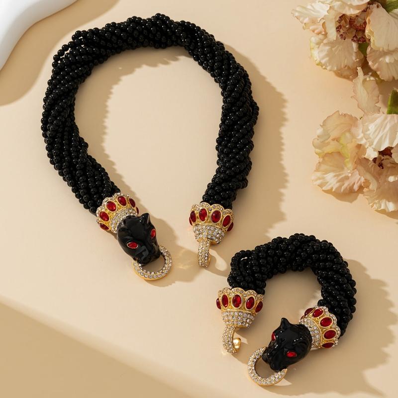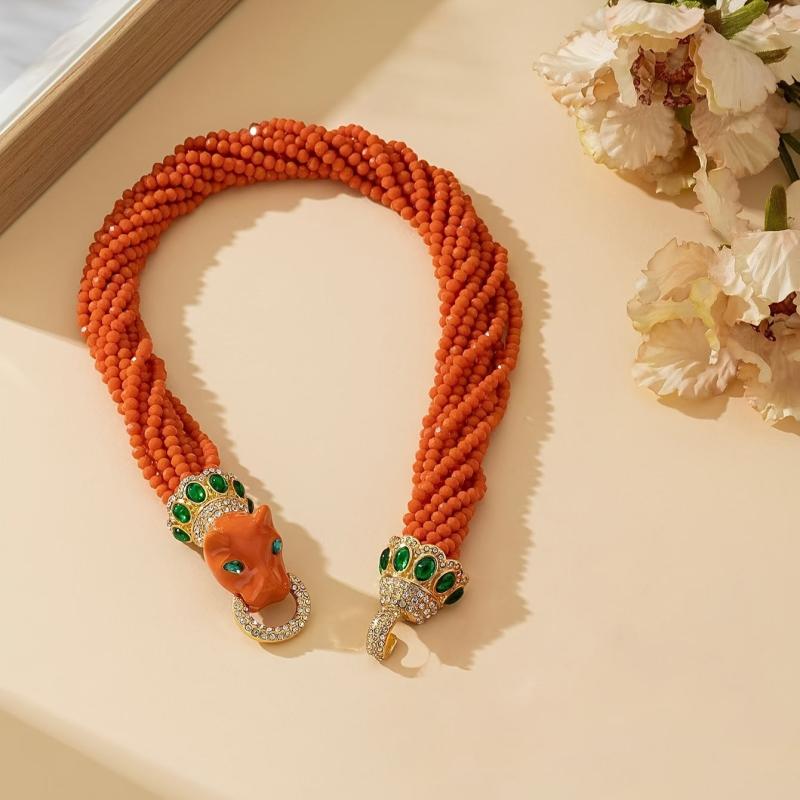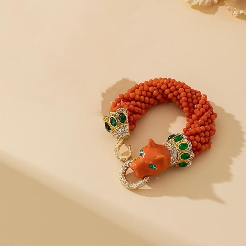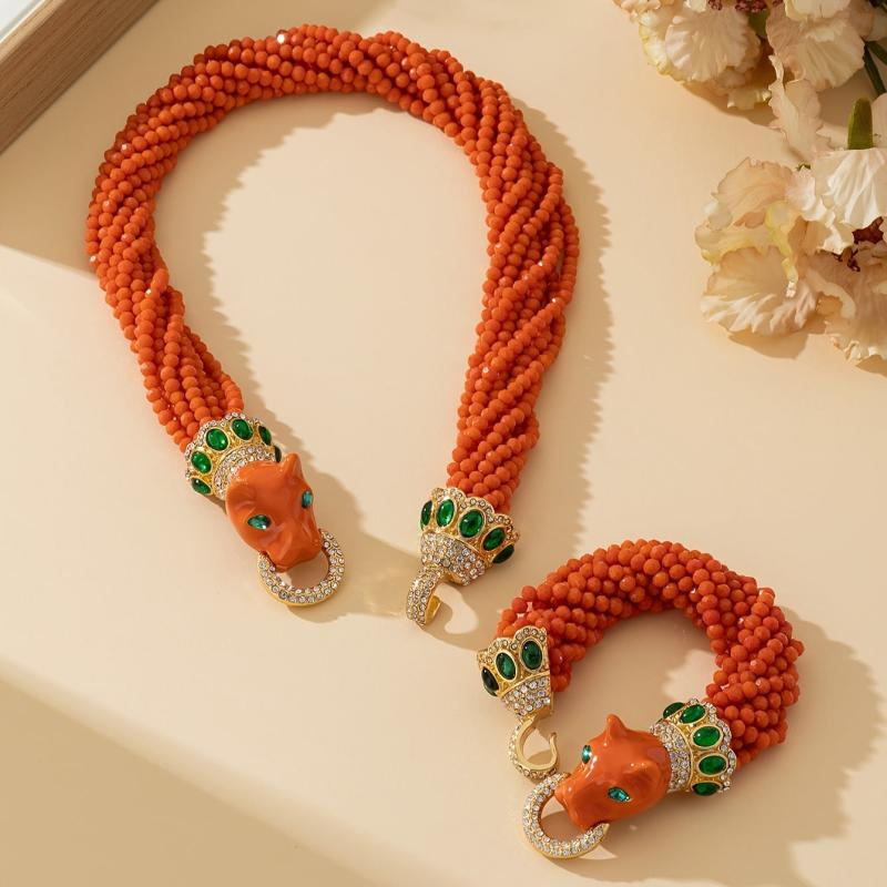 This stunning set includes an orange leopard bracelet and necklace, perfect for daily wear or festive occasions. The heavy glass beads and glaze add an elegant touch to any outfit.