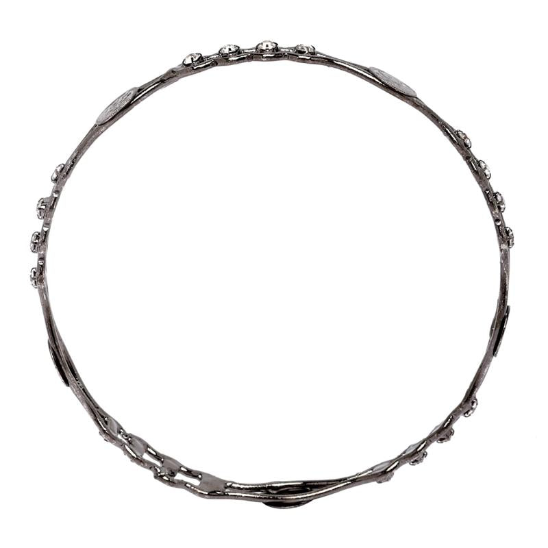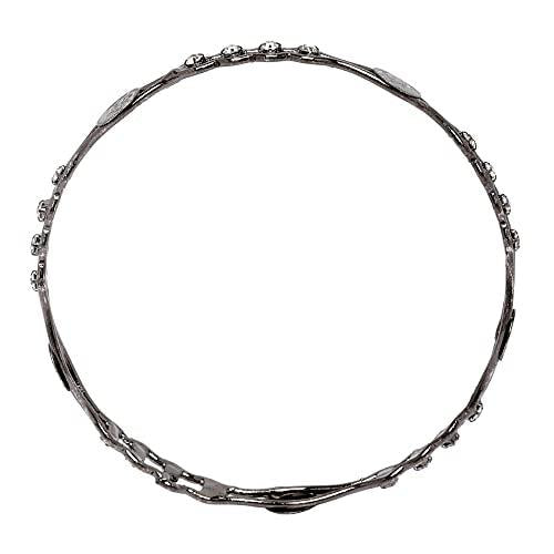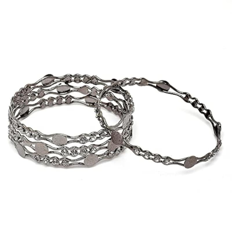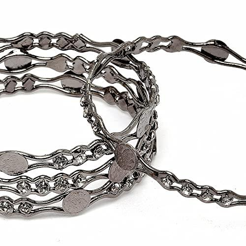 Enhance your traditional look with this stunning oxidised silver-plated toned bangles set. Adorned with AD studs and temple coin design, this set is perfect for special occasions.