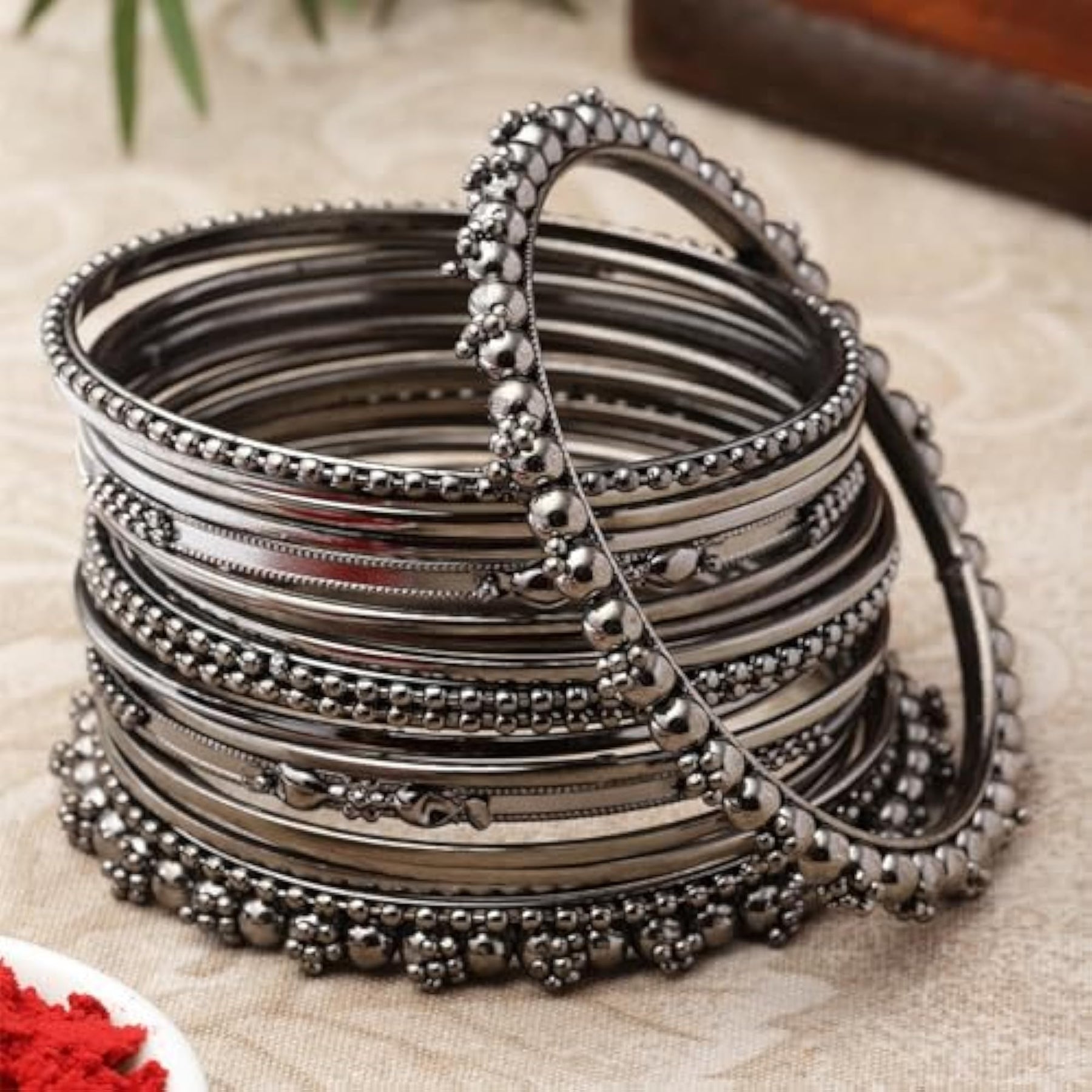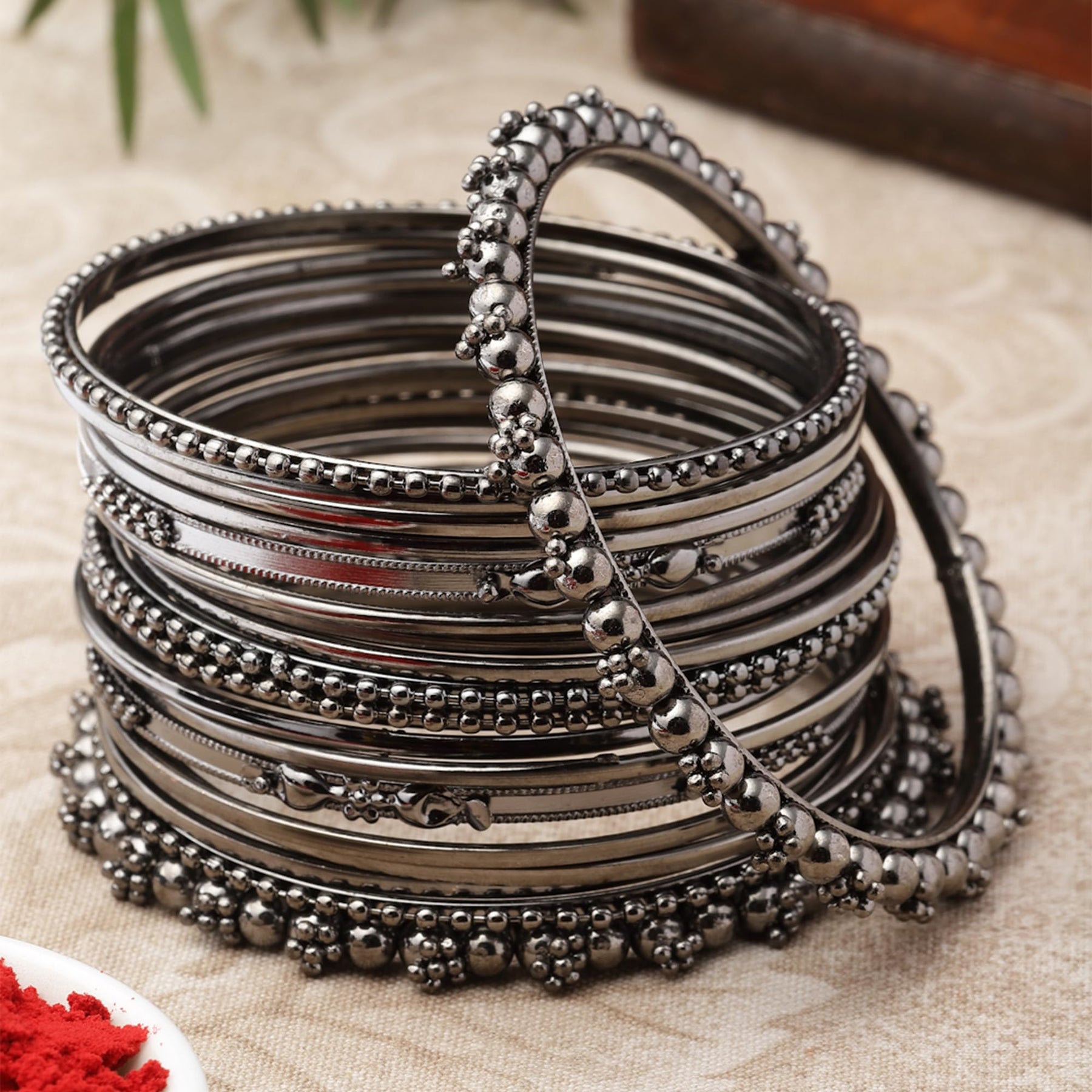 This set includes a pair of oxidised-plated textured bangles in black color. Perfect for adding a touch of elegance to your outfit.