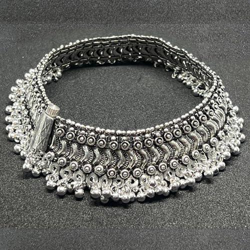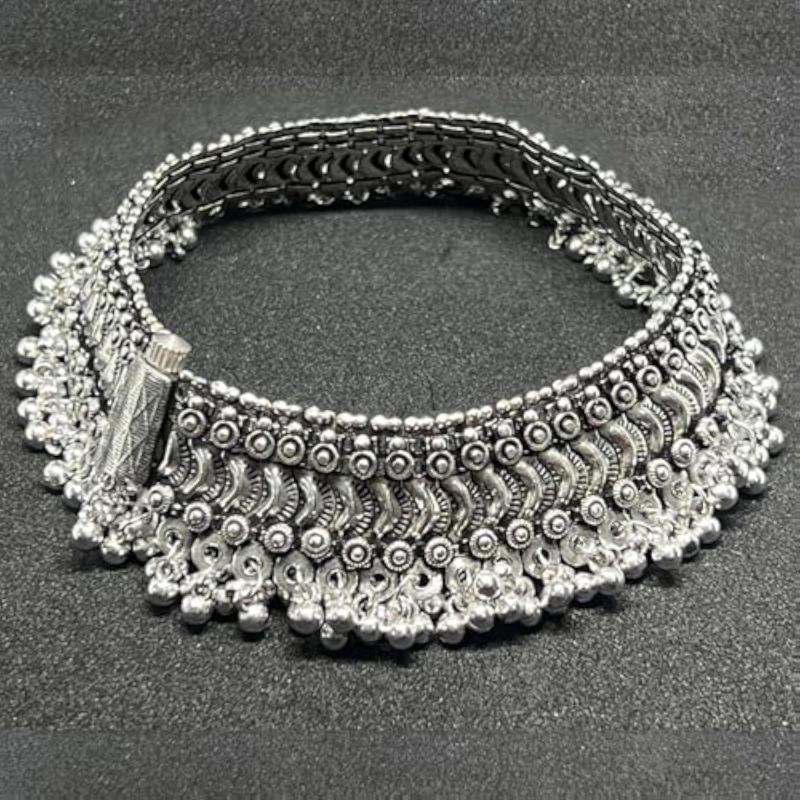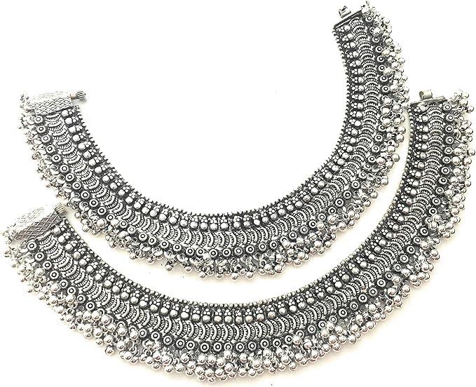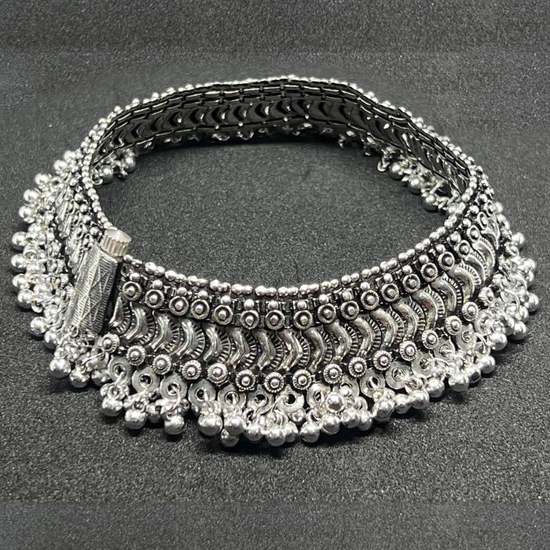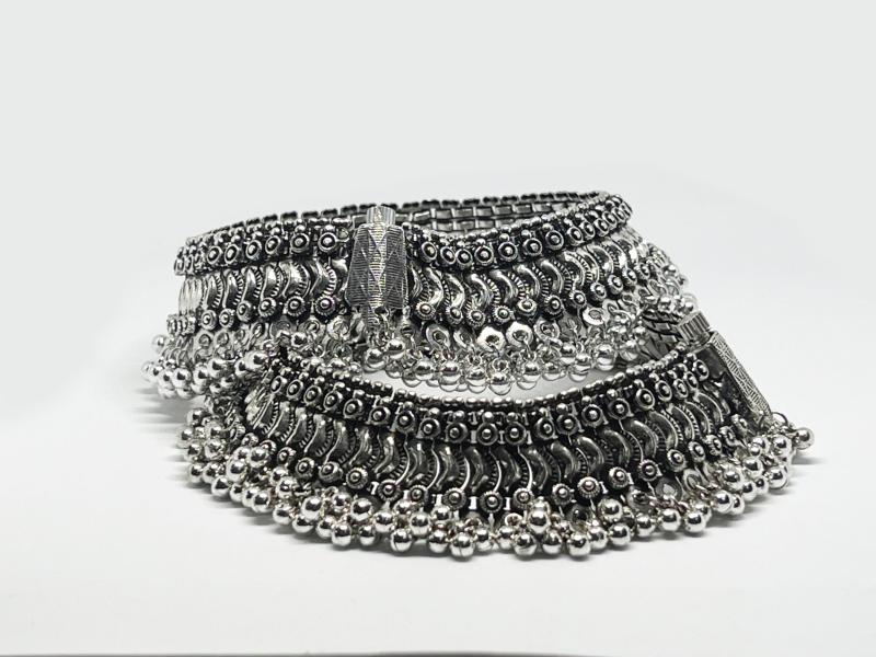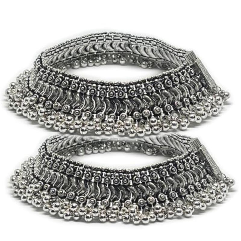 Add a touch of tradition to your ensemble with these broad and heavy German payal anklets. Made with oxidized metal, these anklets are perfect for ethnic occasions.