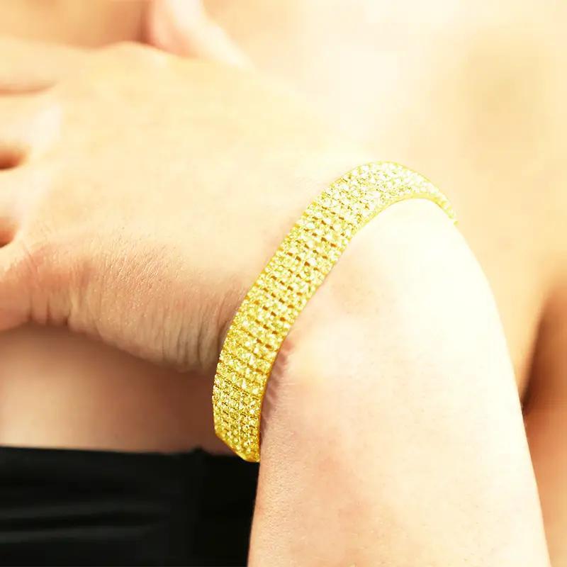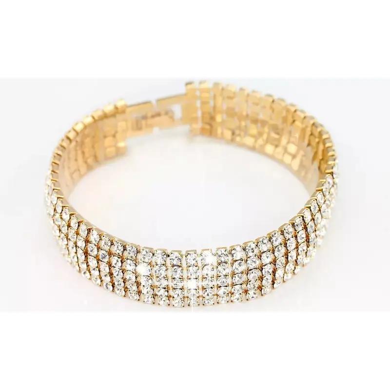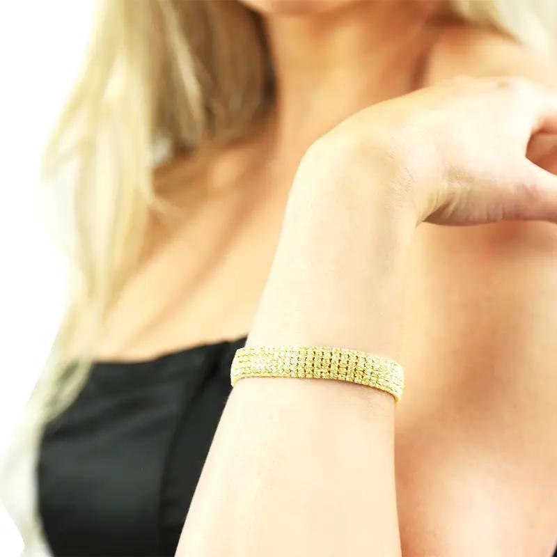 This stunning five row pave bracelet features sparkling crystals set in a golden tone. It is adjustable to fit most wrist sizes and has a secure clip lock clasp. The perfect gift for birthdays, anniversaries, Valentine's Day, and special occasions.