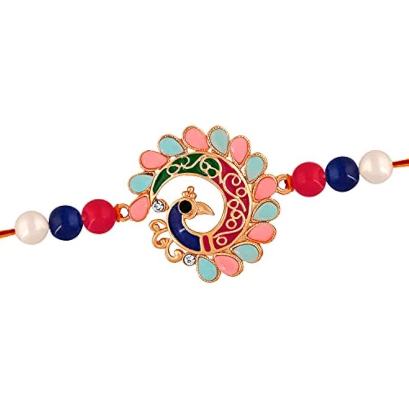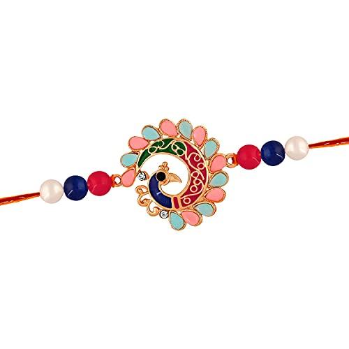 Celebrate Raksha Bandhan with this elegant Peacock Rakhi adorned with crystals and artificial pearl, perfect for gifting to your beloved brothers.
