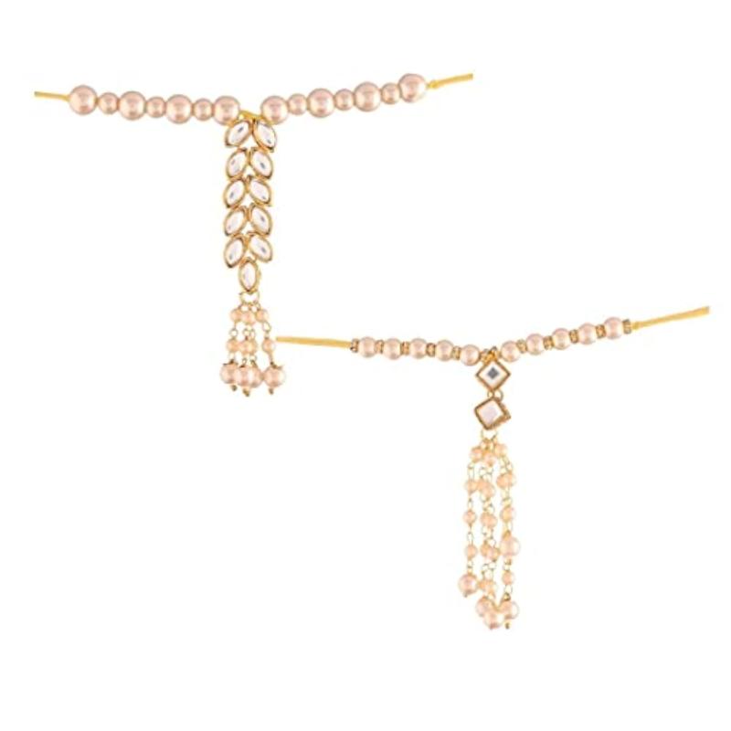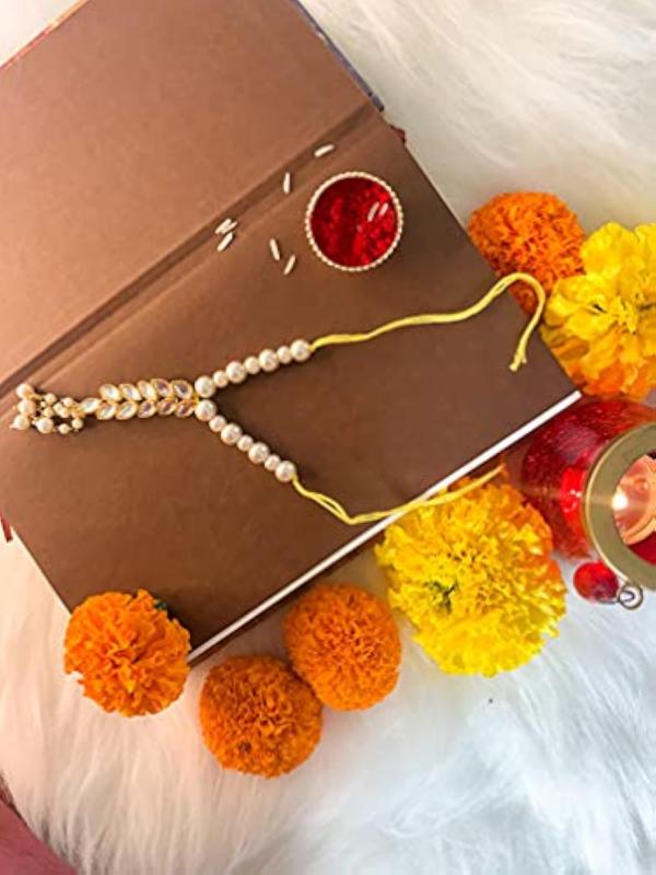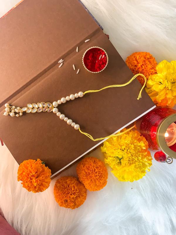 Celebrate the bond with this elegant pearl hanging lumba bracelet rakhi designed for your bhabhi or sister.