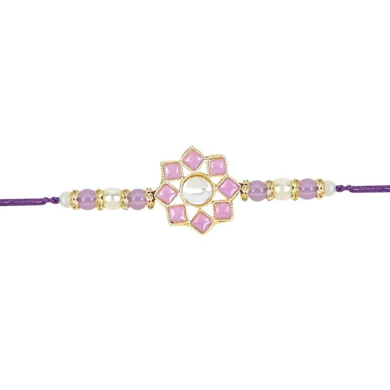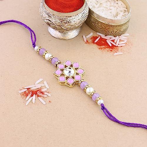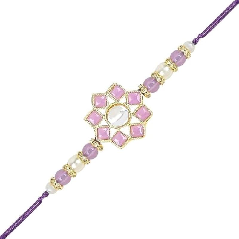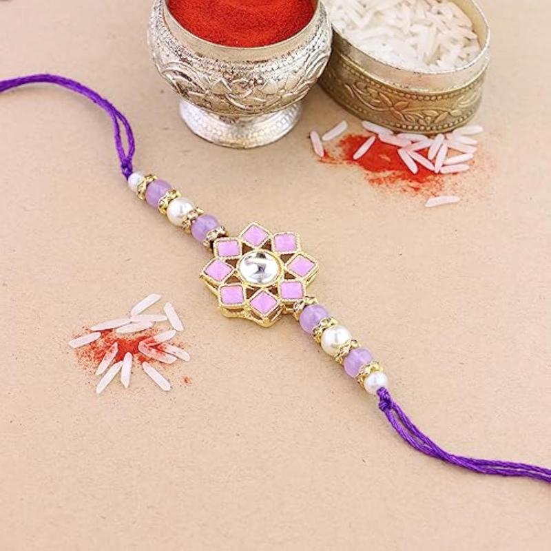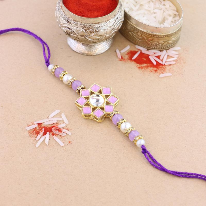 Beautifully crafted Pearl & Kundan Bhaiya Rakhi for brother with Roli Chawal and Rakshabandhan card. Express your love and bond with this exquisite Rakhi.