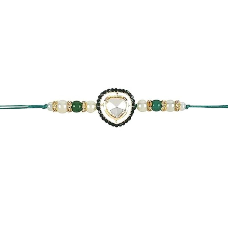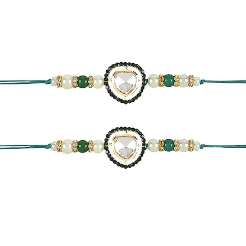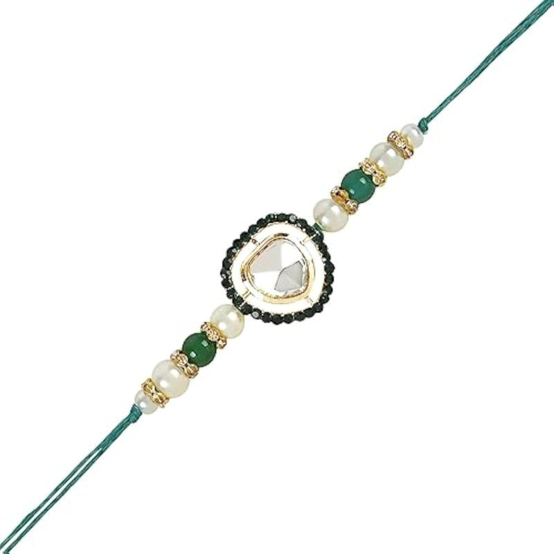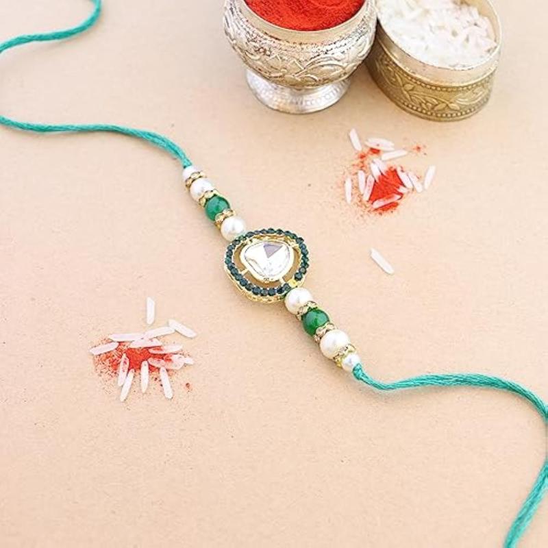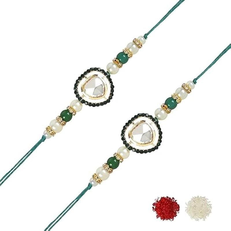 Celebrate Rakshabandhan with this set of 2 elegant Pearl & Kundan Bhaiya Rakhis. Comes with Roli Chawal and Rakshabandhan Card for brother.