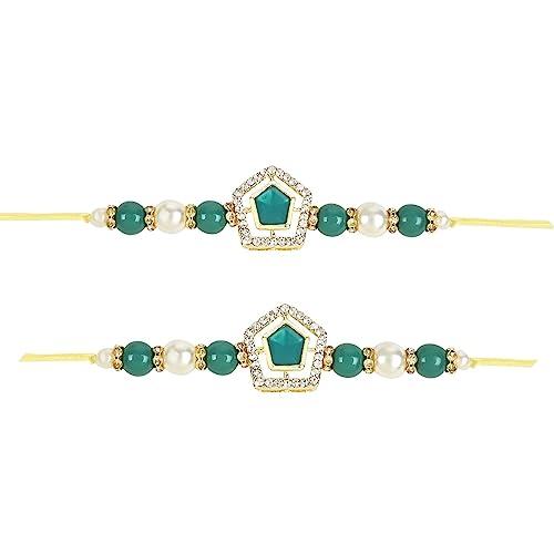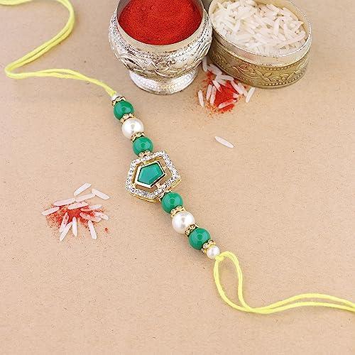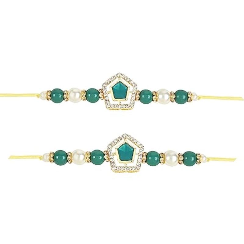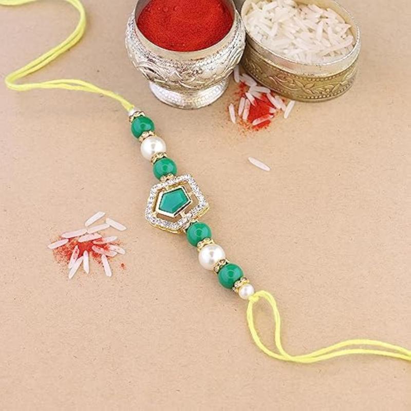 Buy this elegant set of 2 rakhi with pearl and kundan design. Includes Roli Chawal and Rakshabandhan card for your brother to celebrate the occasion.