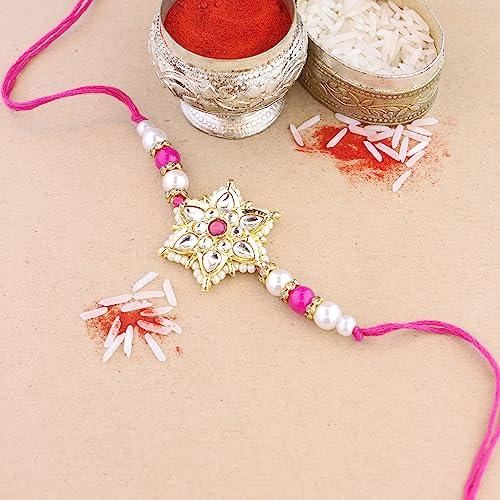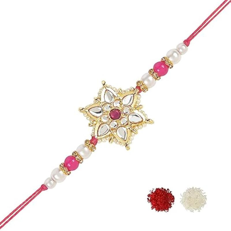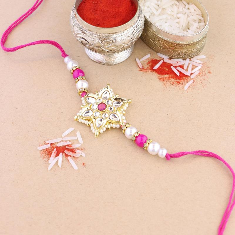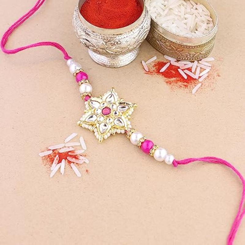 Beautiful rakhi set with traditional pearl and kundan design. Includes Roli Chawal for blessings.