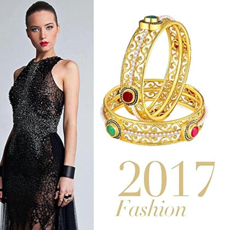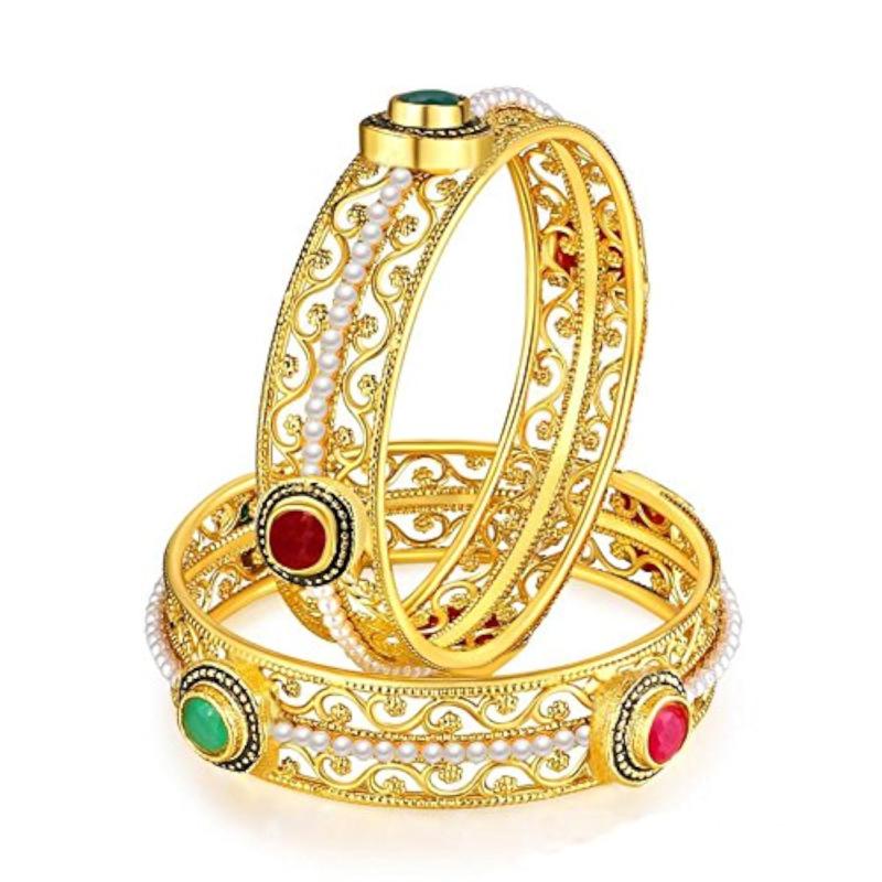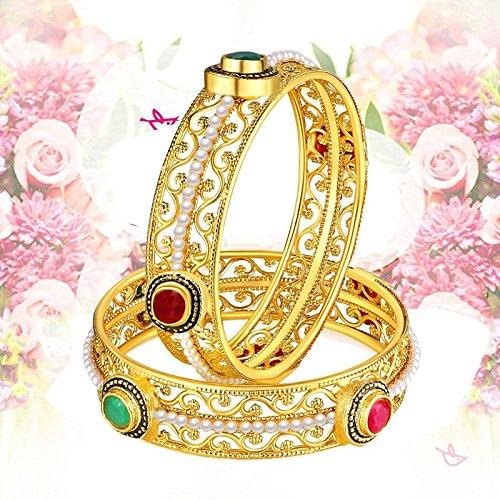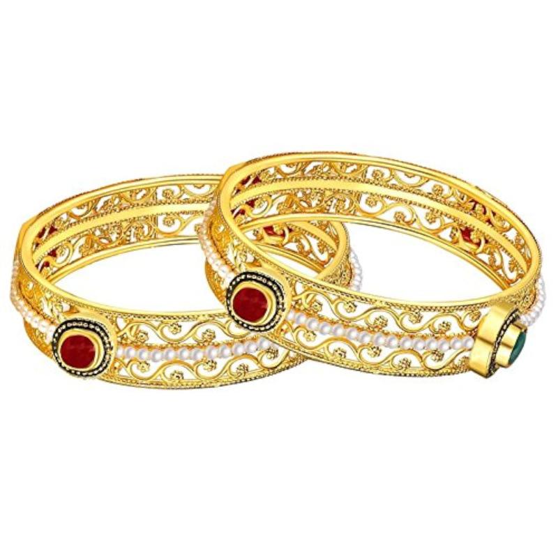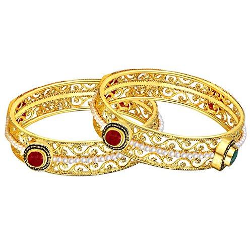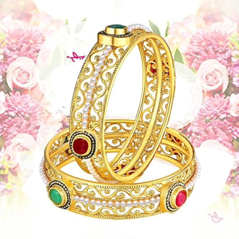 Enhance your look with this stunning traditional bangle set featuring pearls and rubies. Perfect for special occasions.