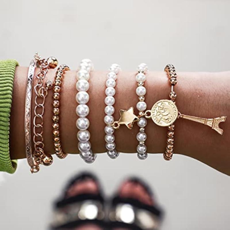 Elegant and stylish bracelet featuring multiple strands with beautiful pearl studs.