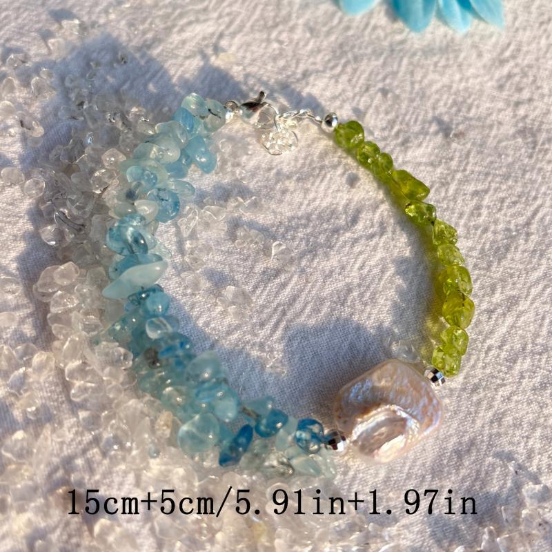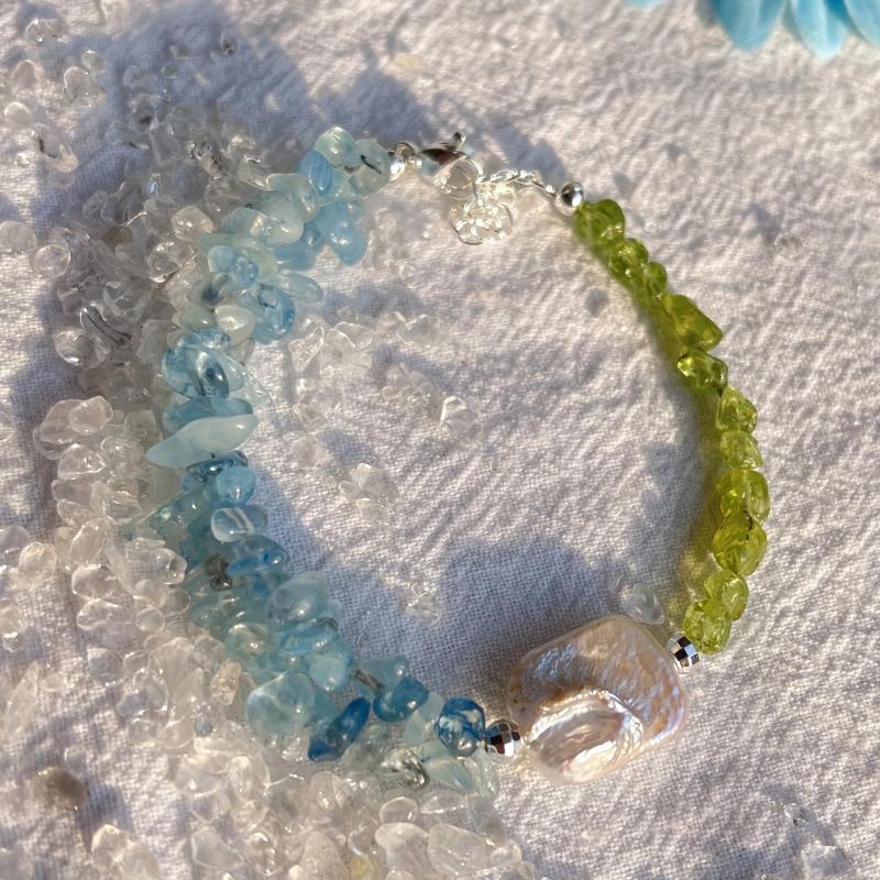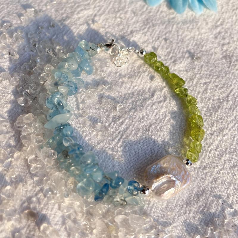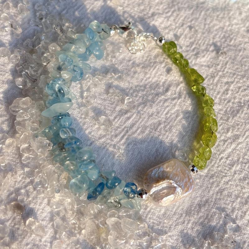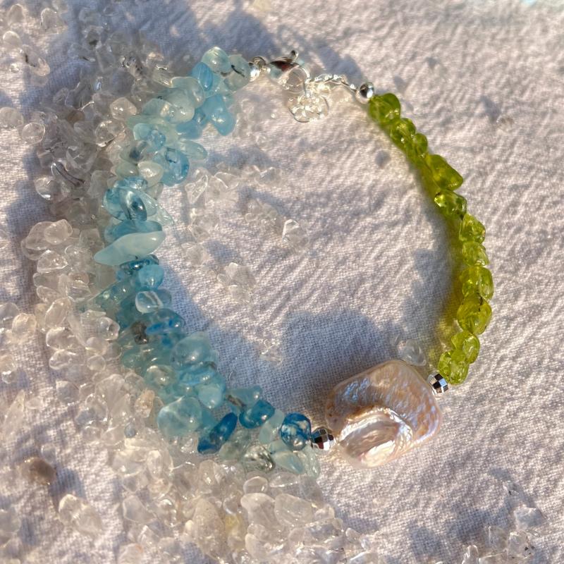 Elegant bracelet featuring natural peridot, aquamarine, and freshwater pearls. Handcrafted with care to add a touch of sophistication to your look.