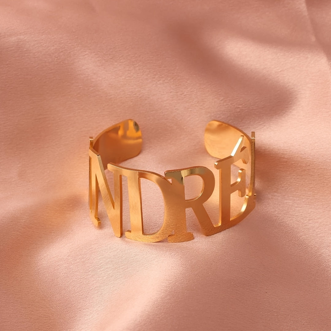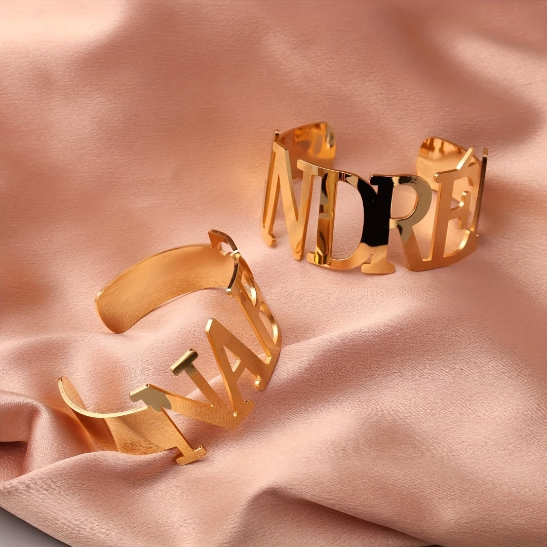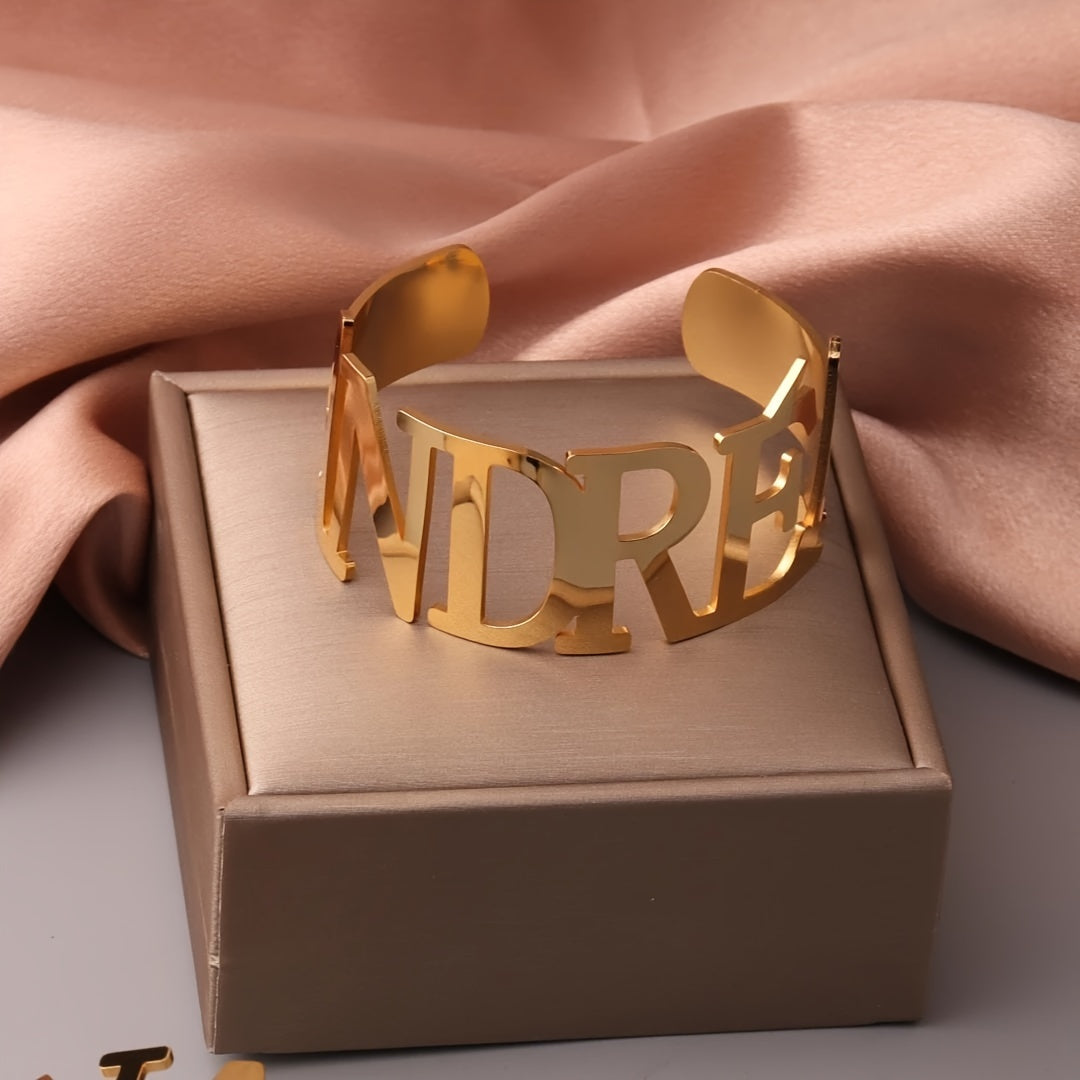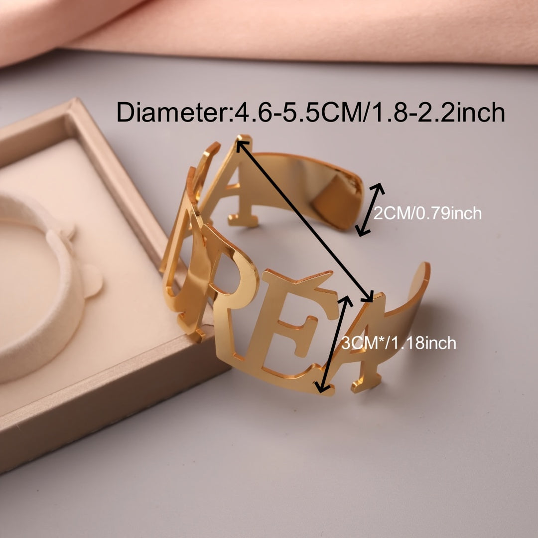 This stainless steel bracelet features a large size plaque that can be personalized with your name or initials. It is open and adjustable, making it suitable for all wrist sizes. A stylish accessory for ladies that adds a touch of punk to any outfit.