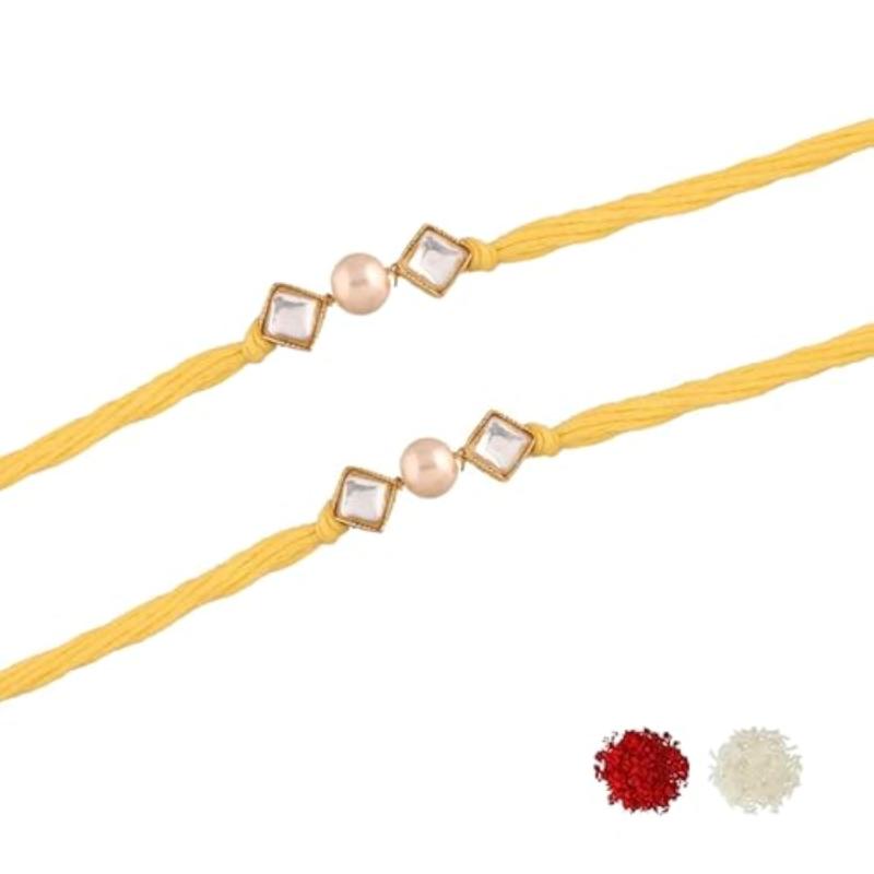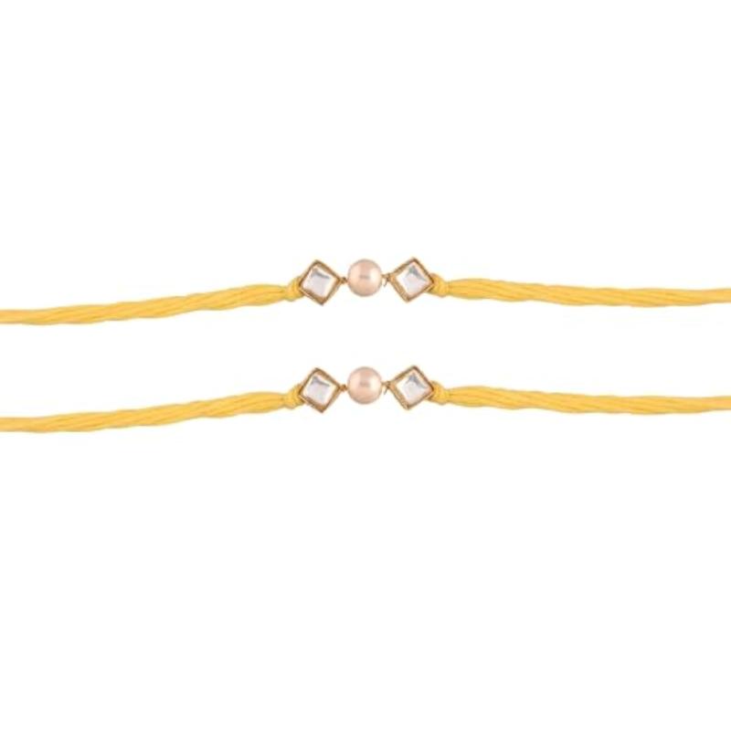 Celebrate Rakshabandhan with this beautiful plated ethnic pearl kundan combo rakhi set. Includes Roli Chawal and Rakshabandhan card.