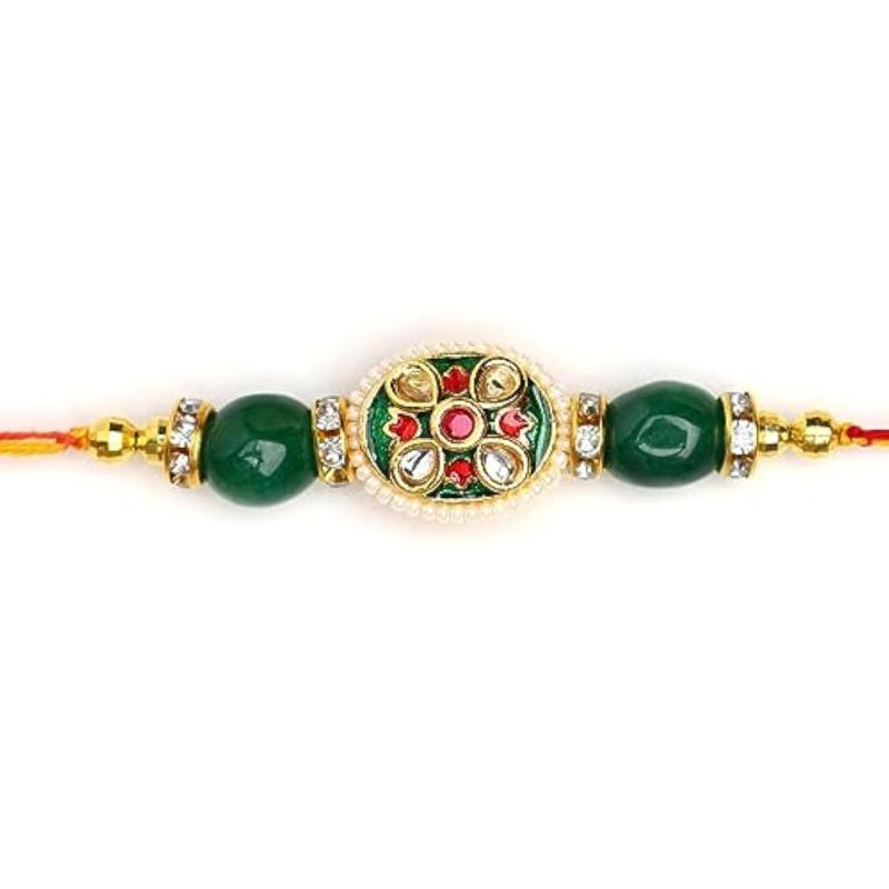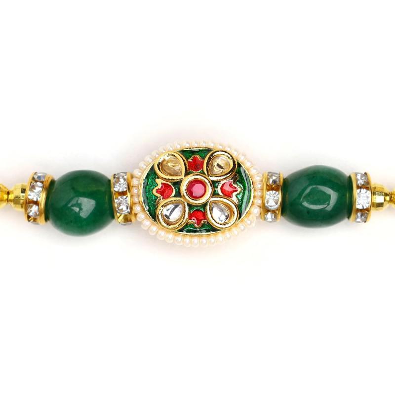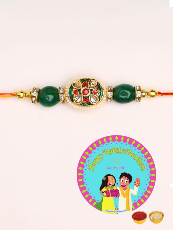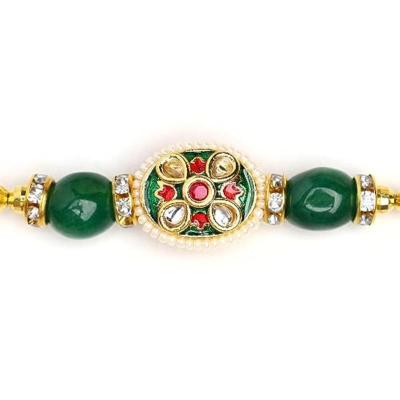 Celebrate Rakshabandhan with this traditional rakhi adorned with semi precious stones and meenakari work. Comes with a pack of Roli Kumkum for the auspicious occasion.