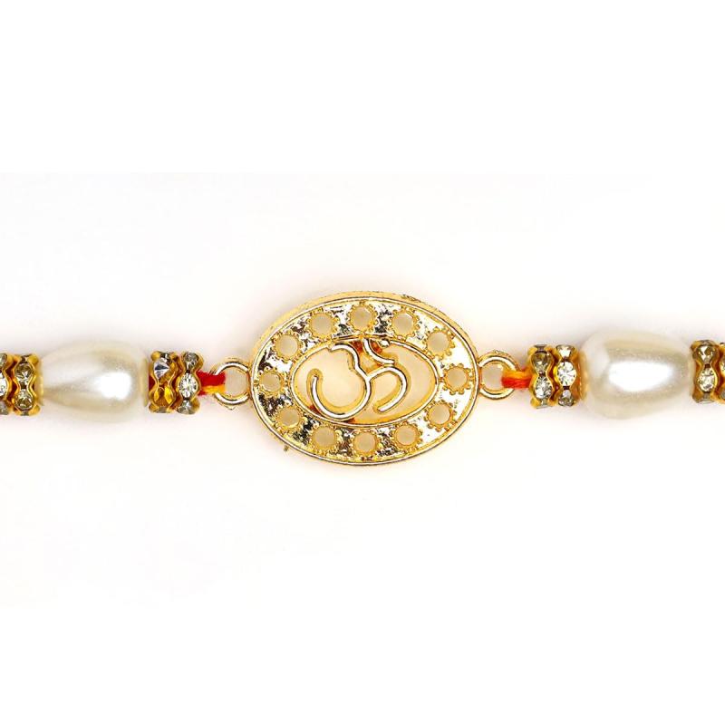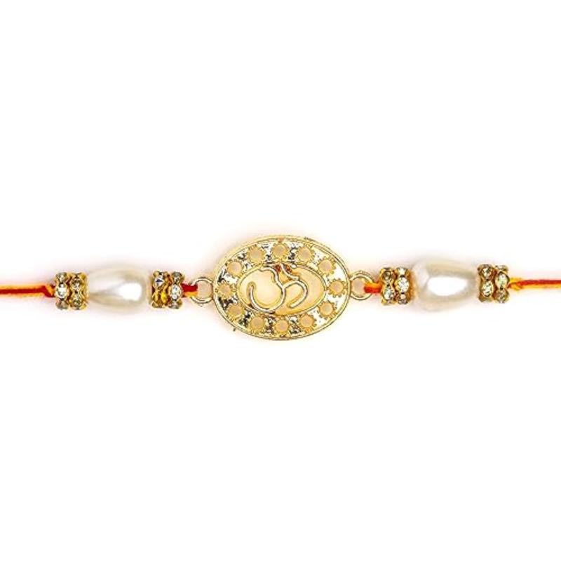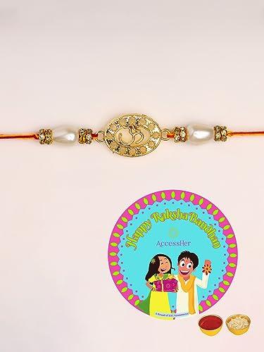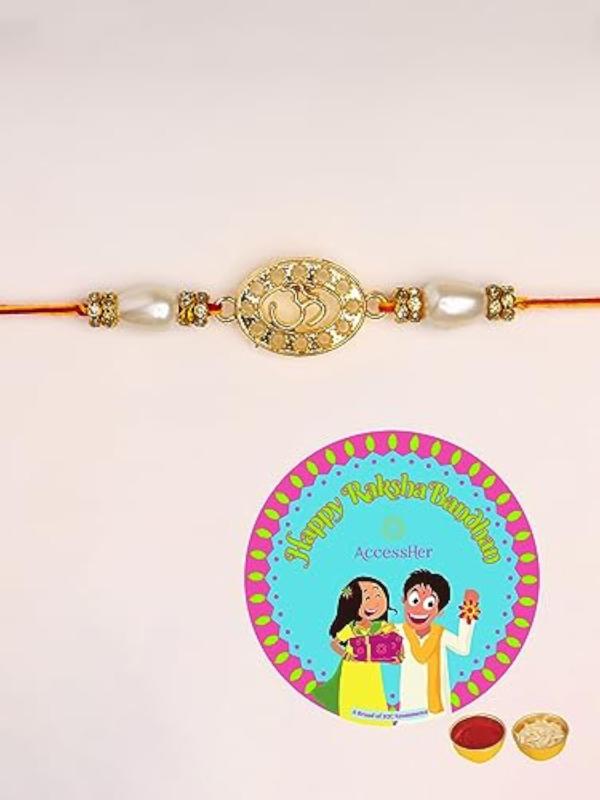 Celebrate Raksha Bandhan with this traditional plated metallic OM deity inspired rakhi. The set includes 1 rakhi with roli kumkum packets and a happy card.