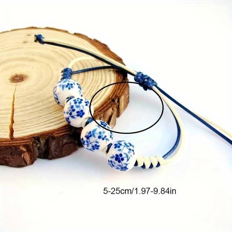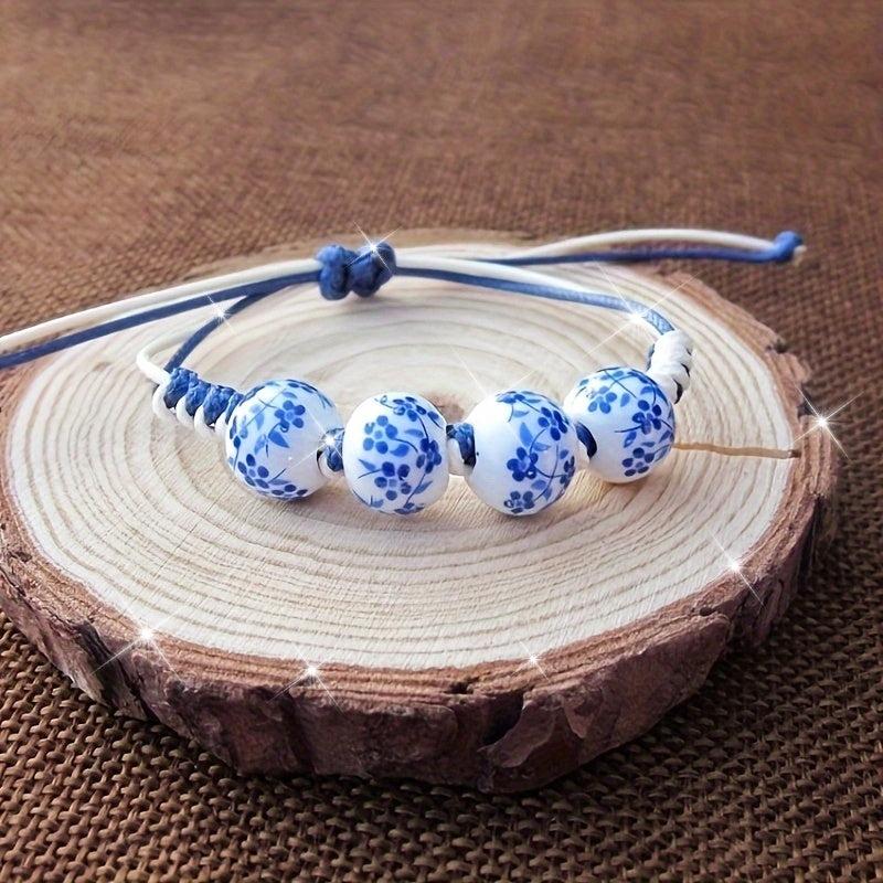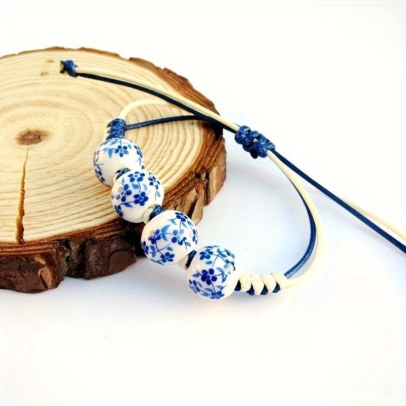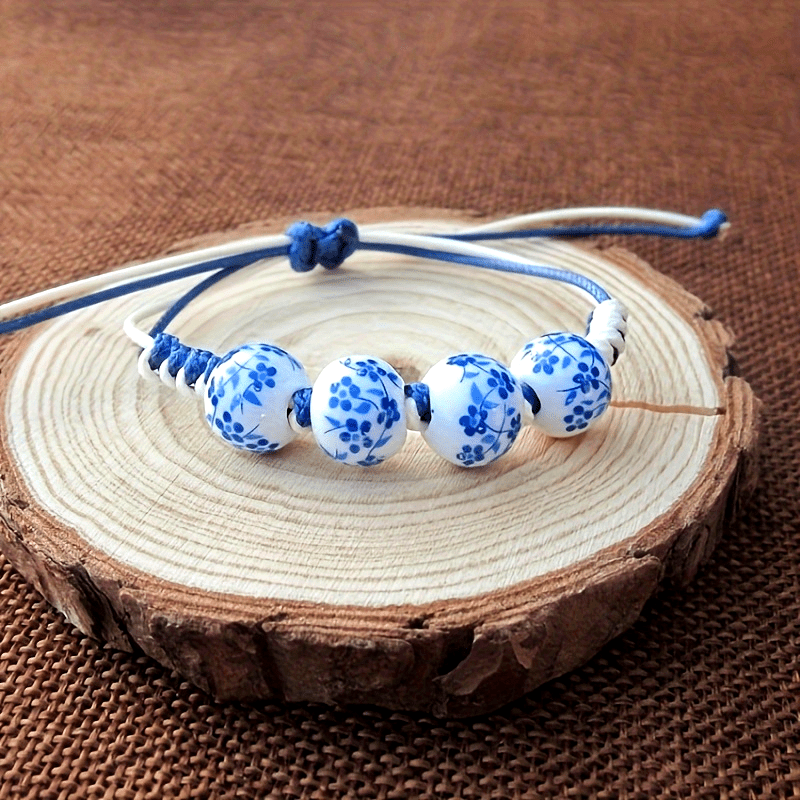 This bracelet is handcrafted with porcelain beads for a unique and elegant look. It features an adjustable design for a comfortable fit.