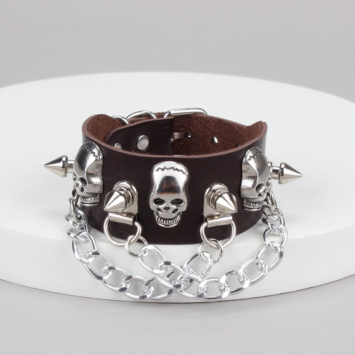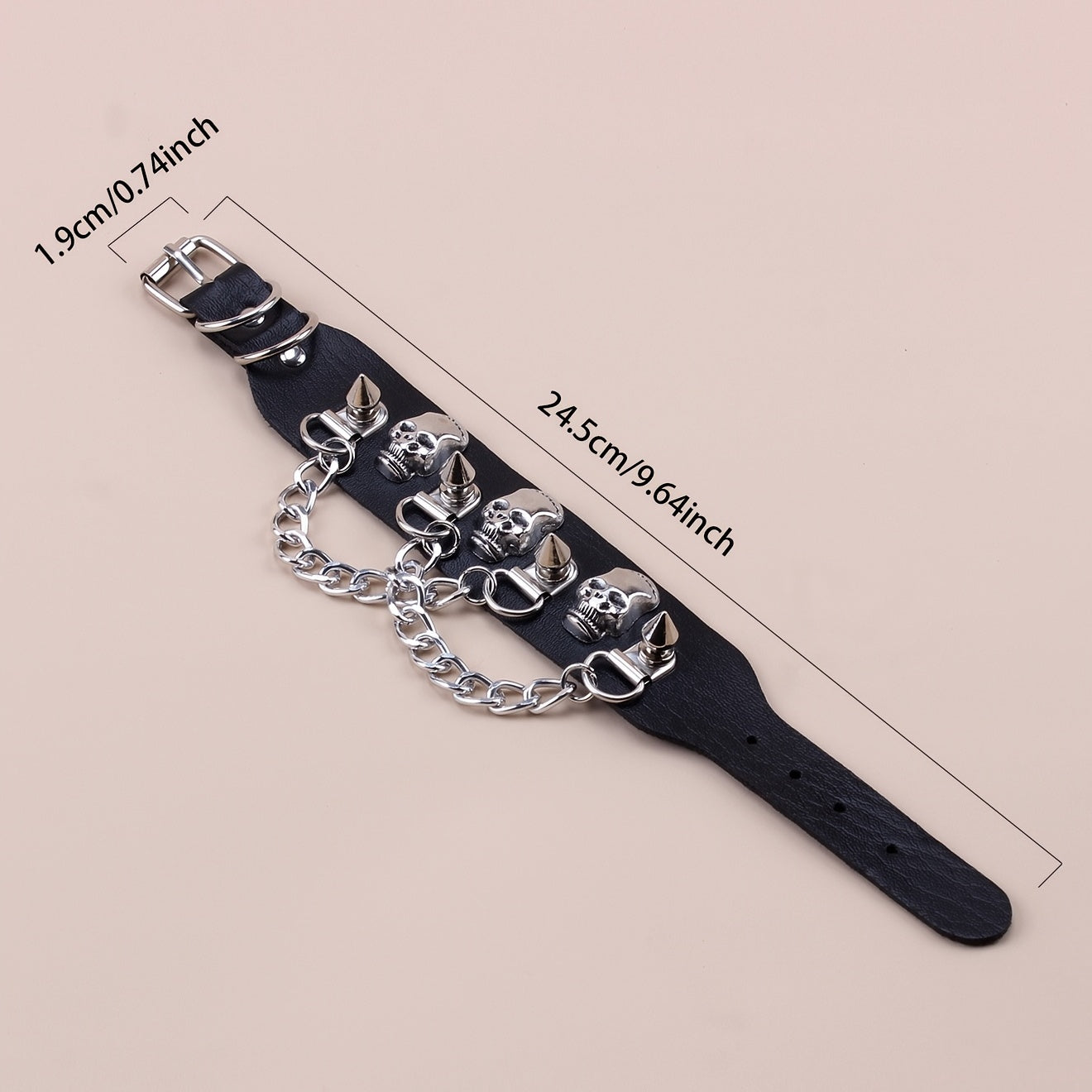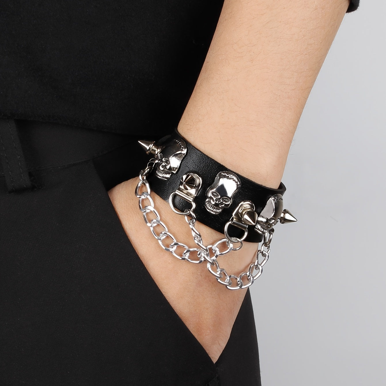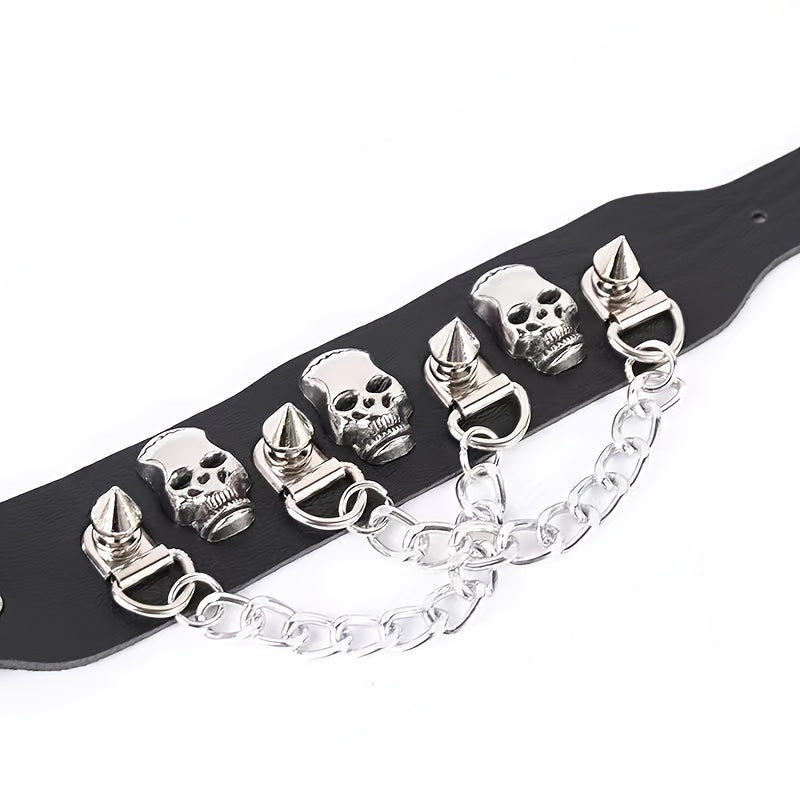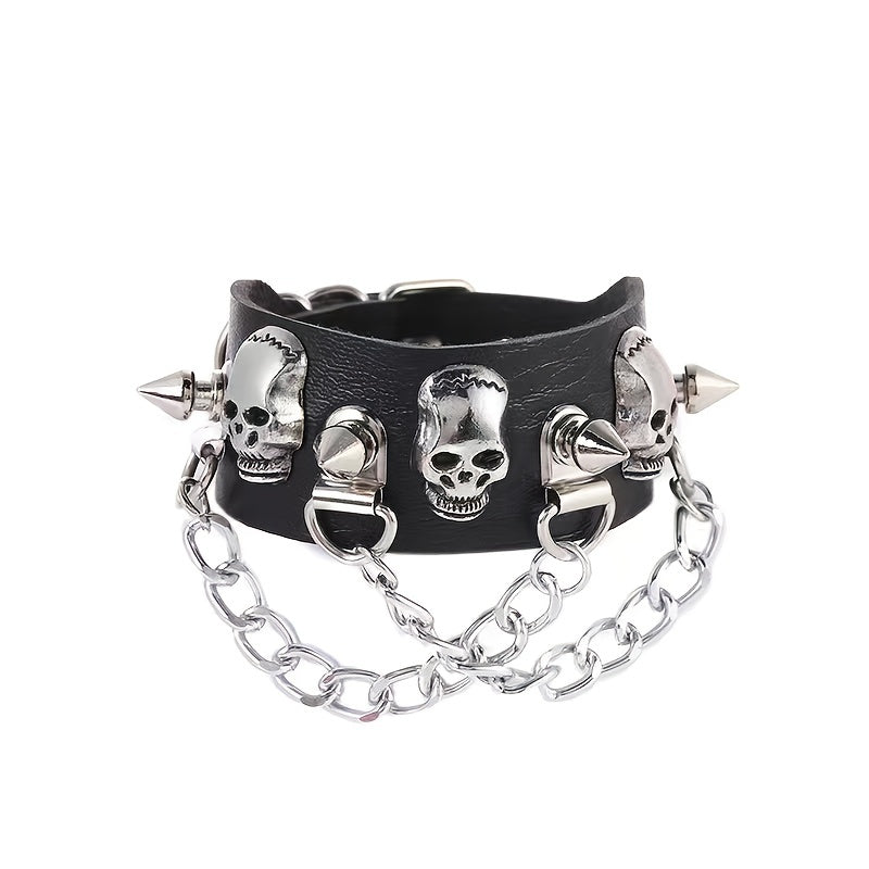 Add an edgy vibe to your outfit with this punk-inspired skull nail chain tassel bracelet made of durable PU leather.