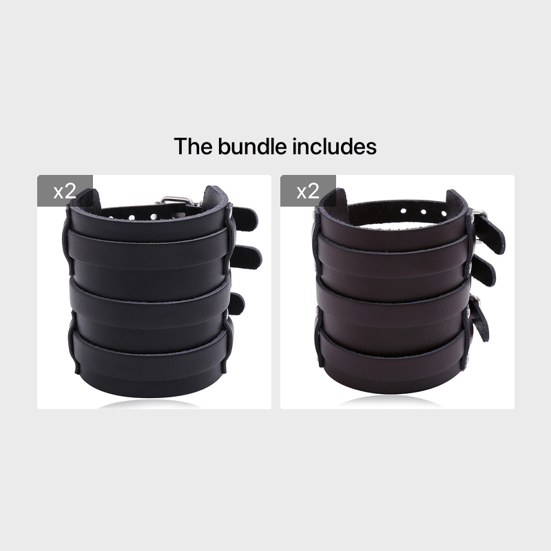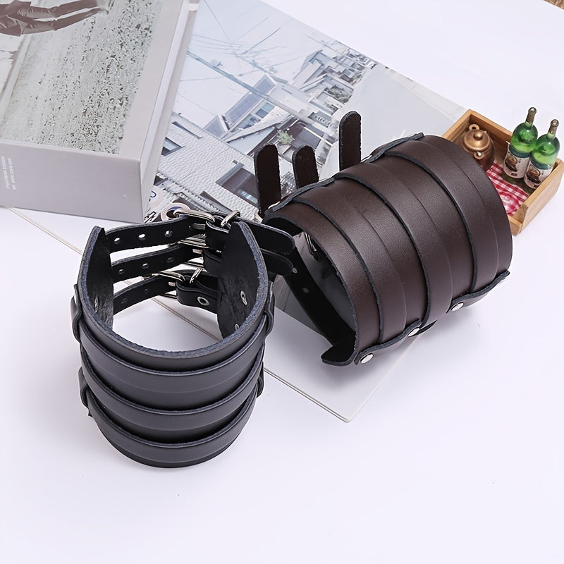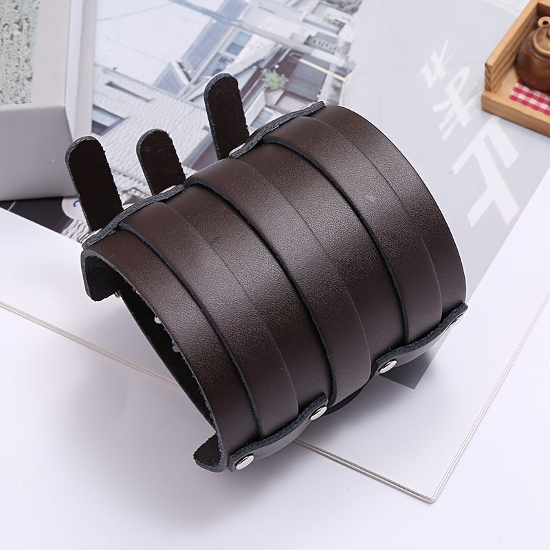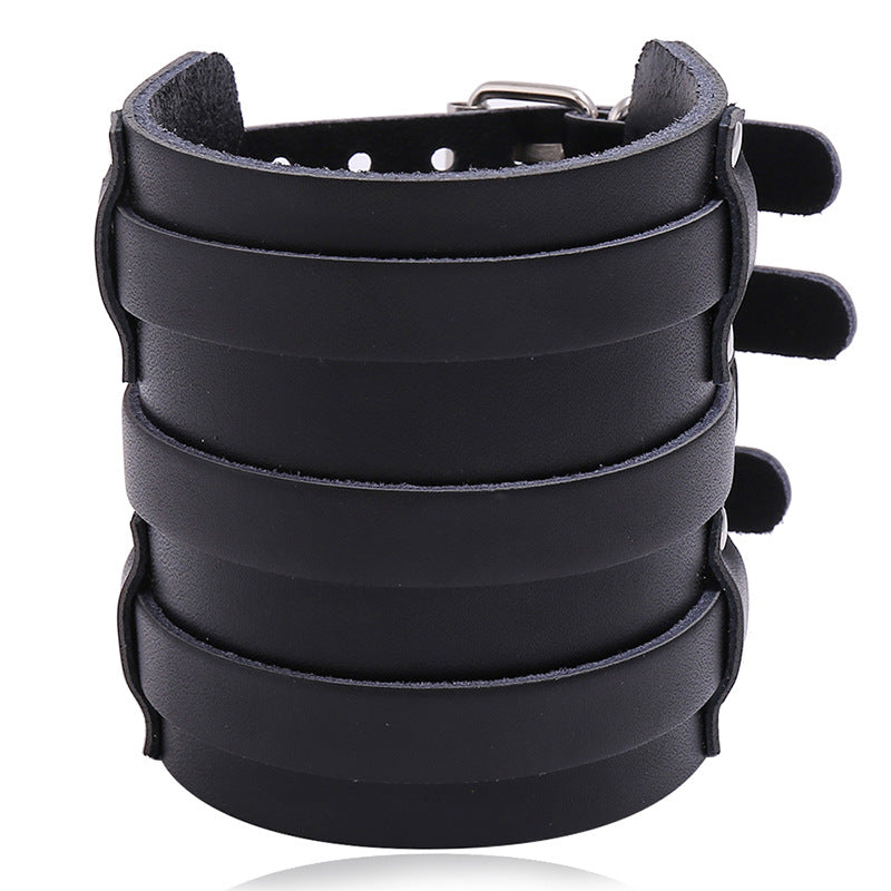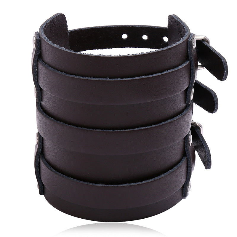 Enhance your punk style with this wide leather bracelet featuring a guard wristband design.