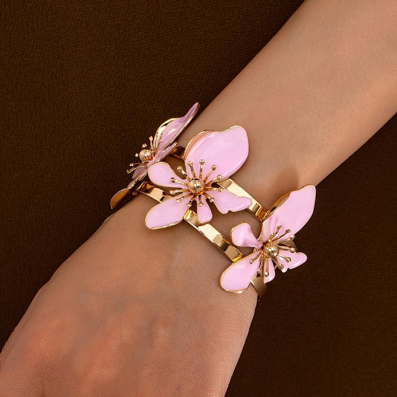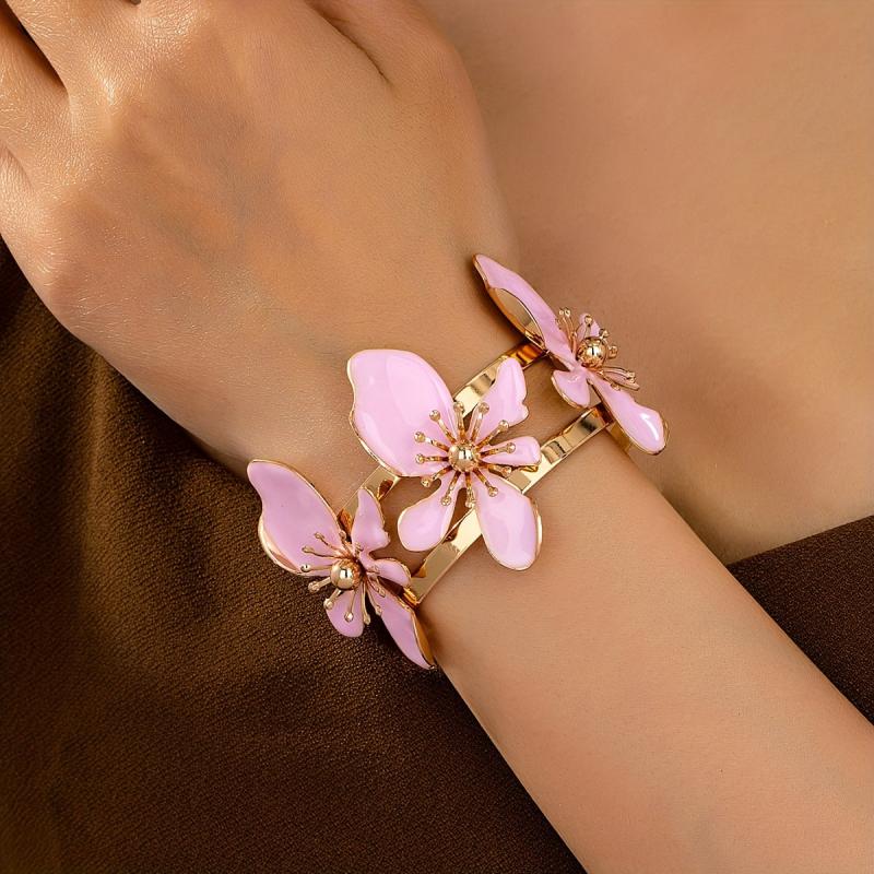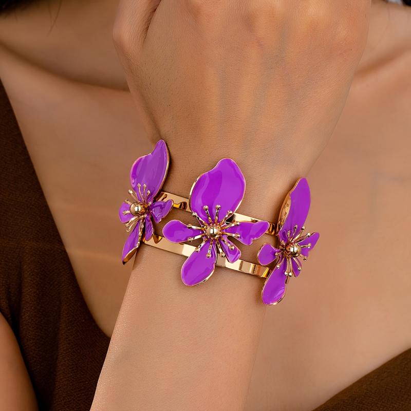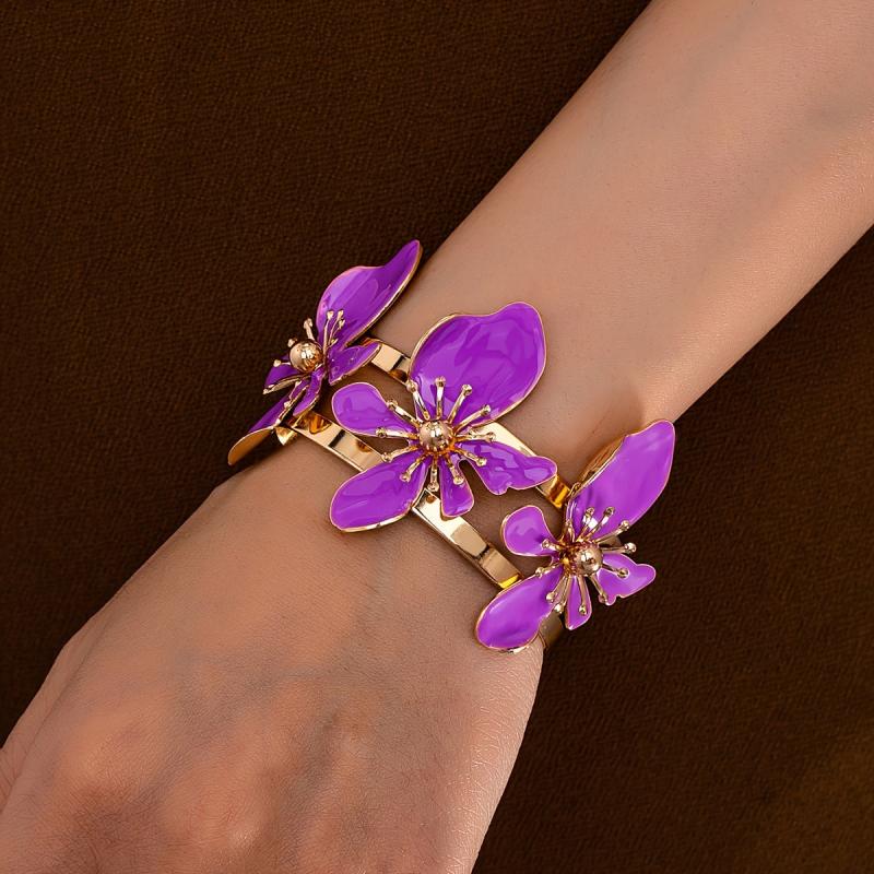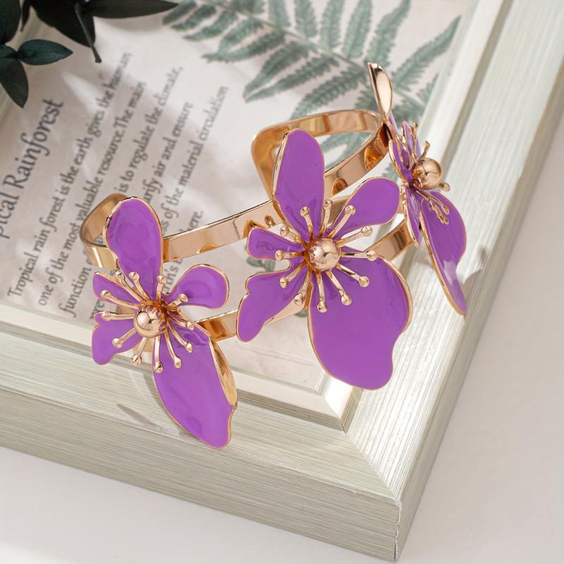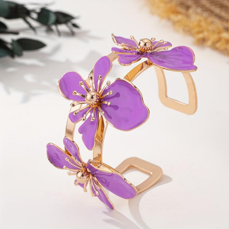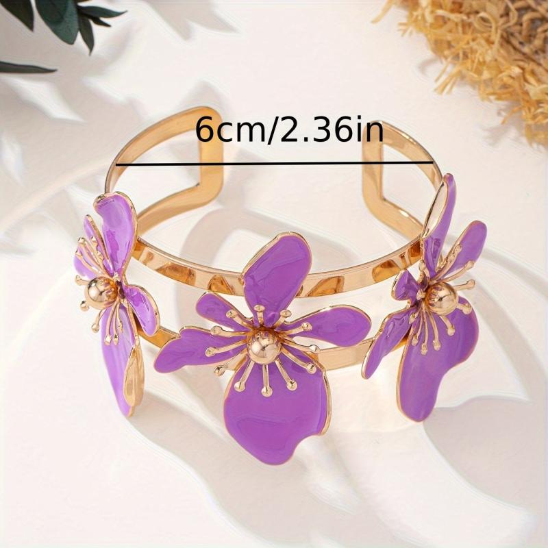 Elegant open bangle bracelet featuring purple floral design with golden tone accents. Perfect for daily wear or parties, this versatile accessory adds a touch of style to any outfit.