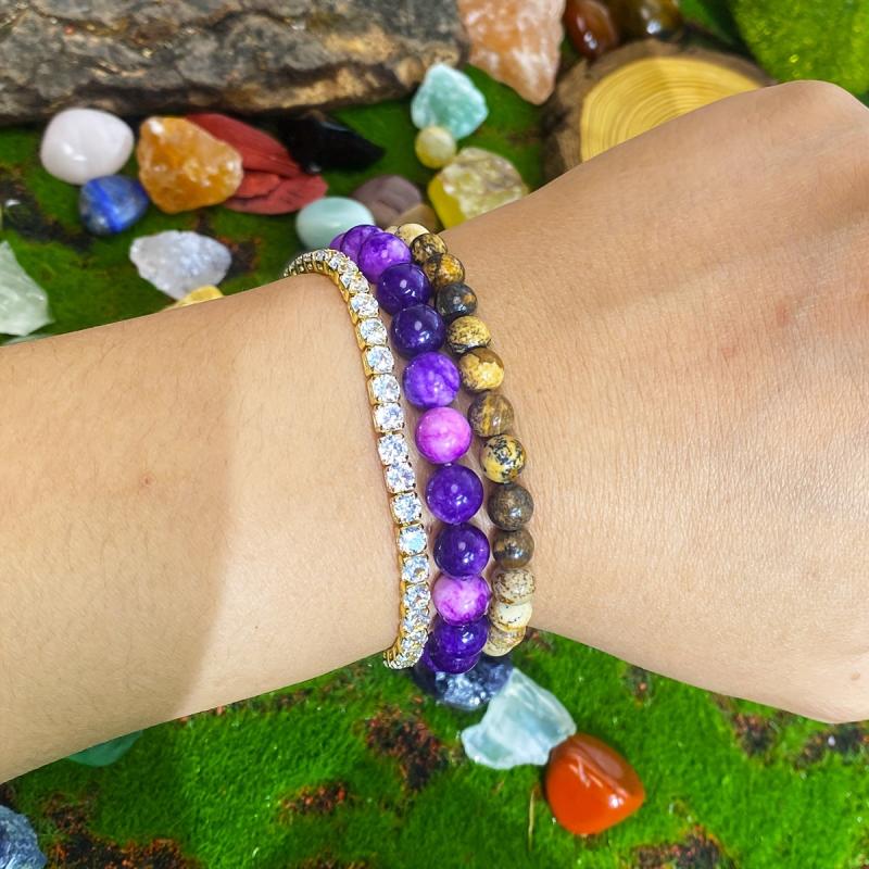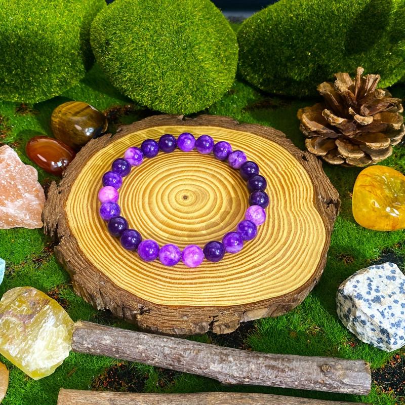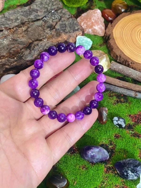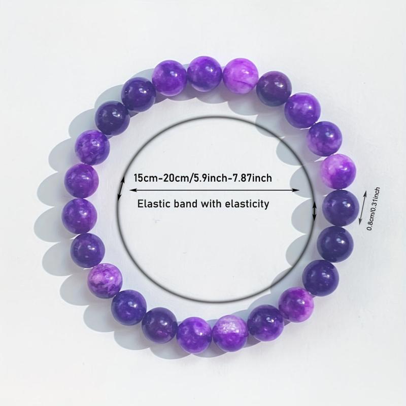 This 8mm purple sugilite beaded bracelet is a unisex jewelry piece that symbolizes wisdom, love, and happiness. It is elastic and suitable for both men and women.