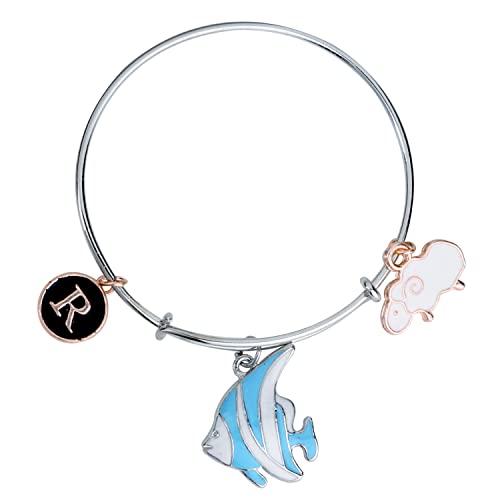 Adorn your wrist with this delightful charm bracelet featuring R letter and fish-shaped rhodium plated charms. Perfect for everyday wear or special occasions.