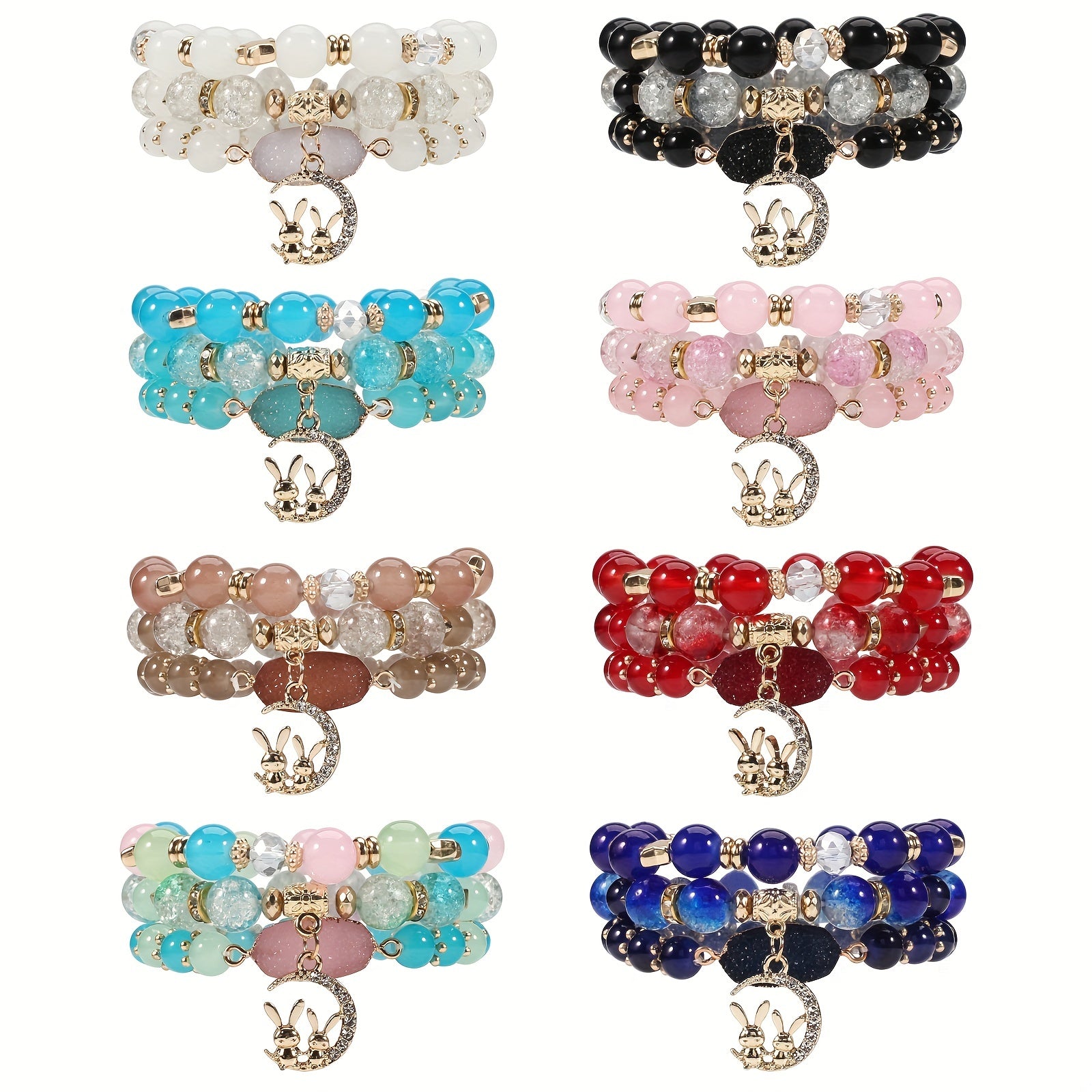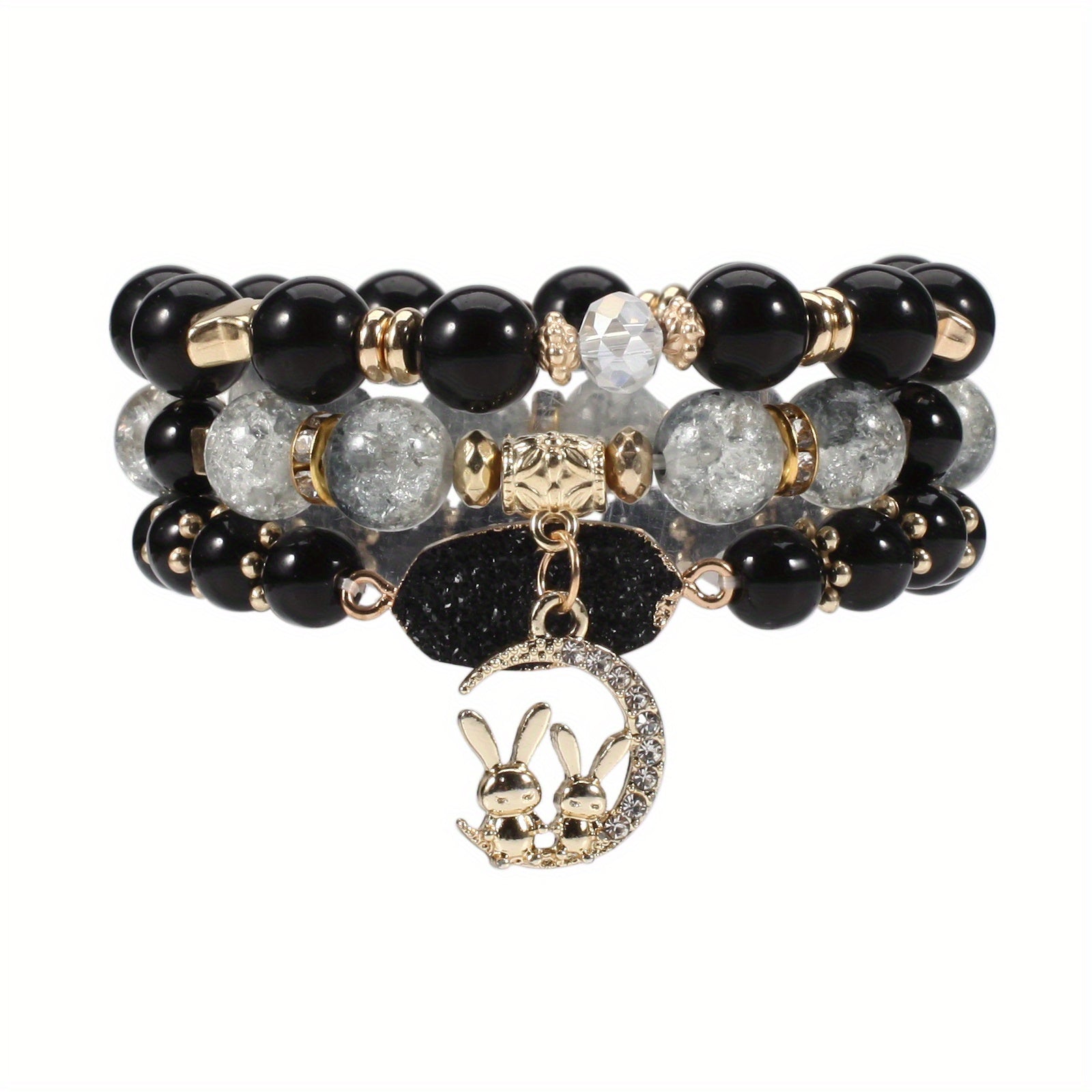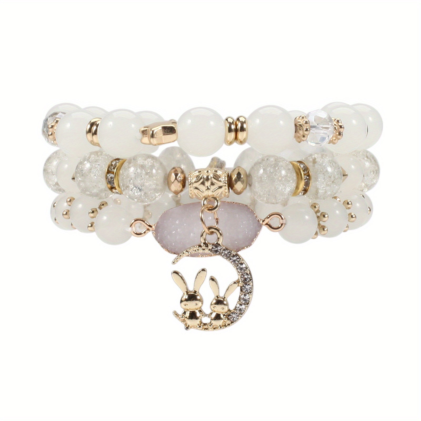 This beautiful bracelet features a rabbit and moon pendant along with colorful beads on multiple layers. It is stretchable for easy wear.
