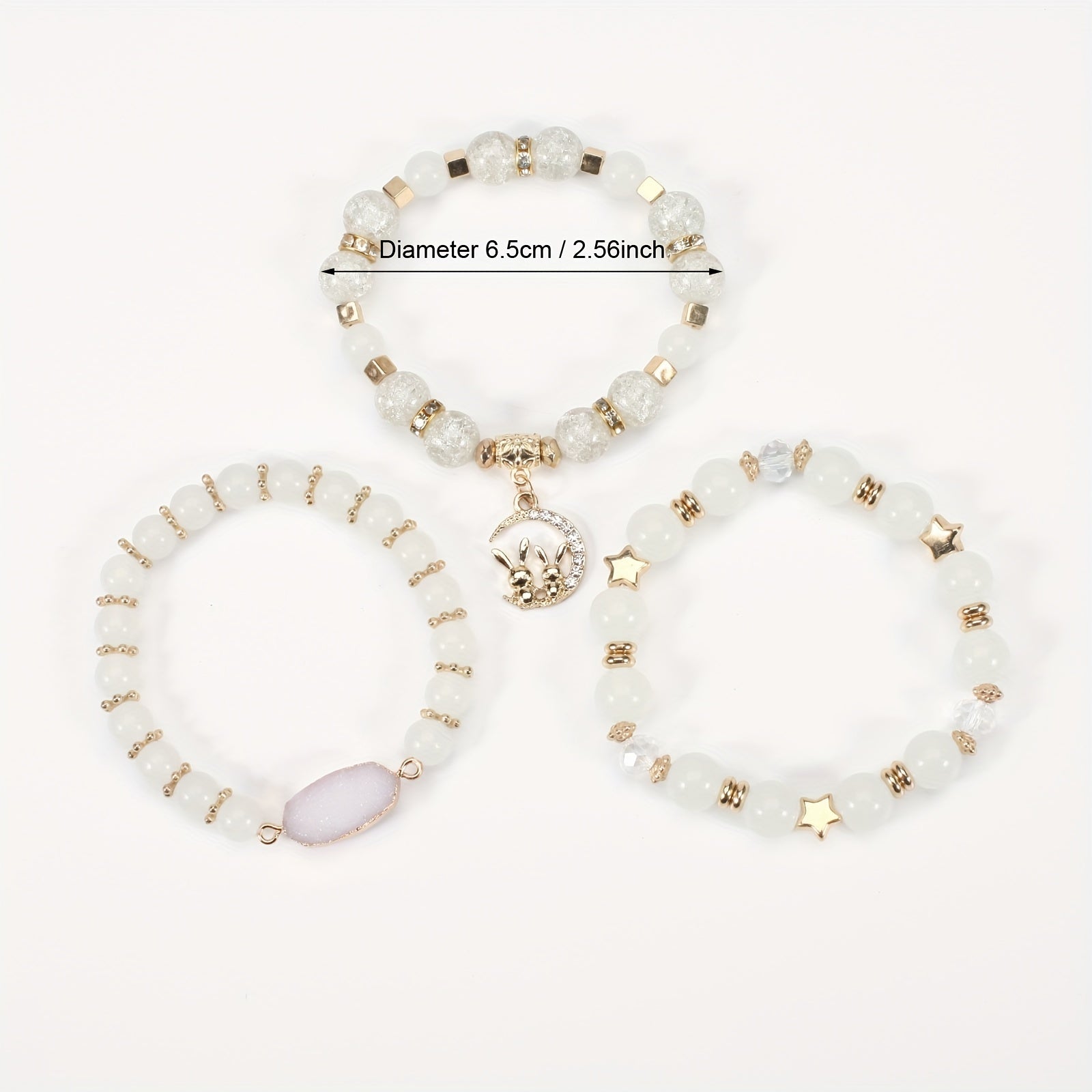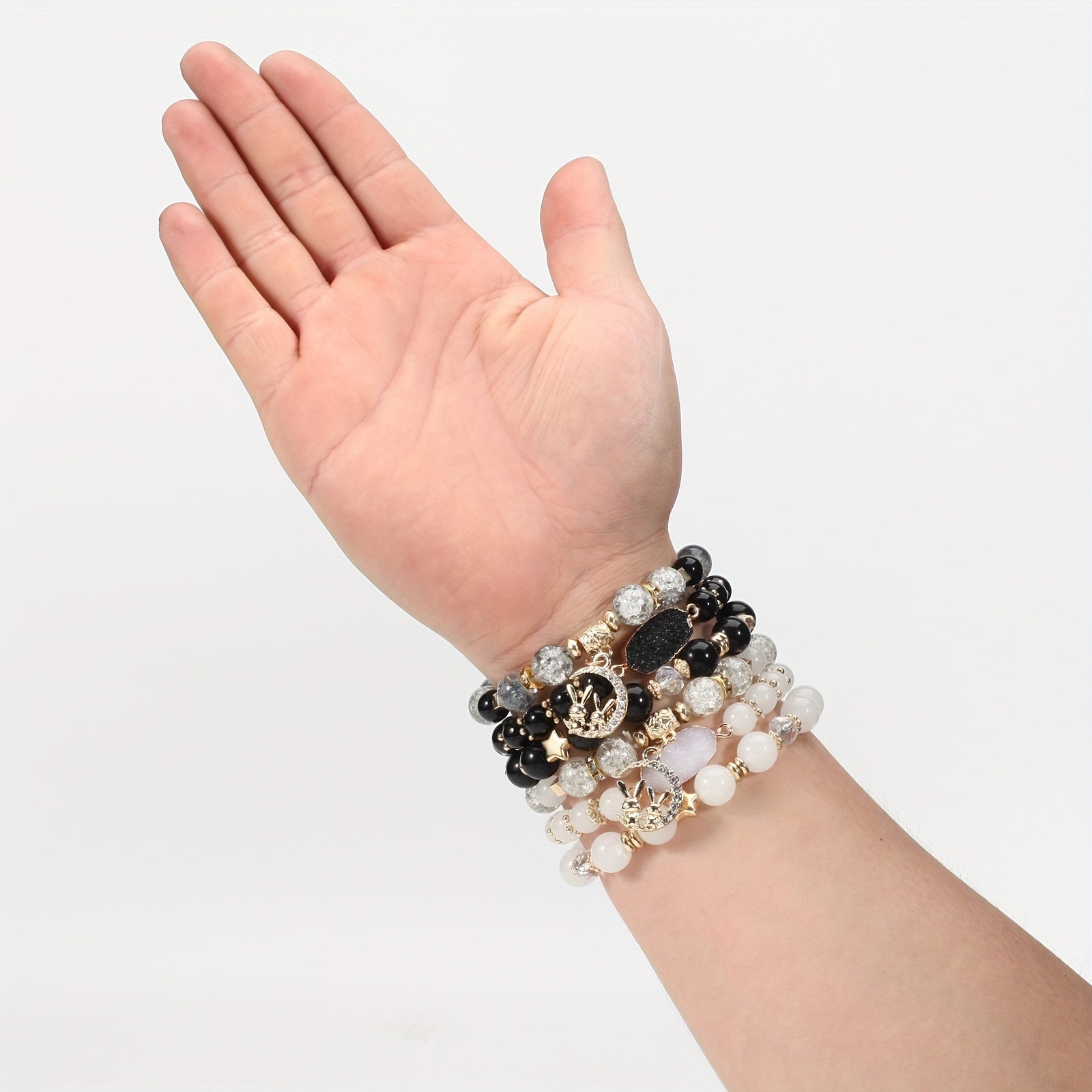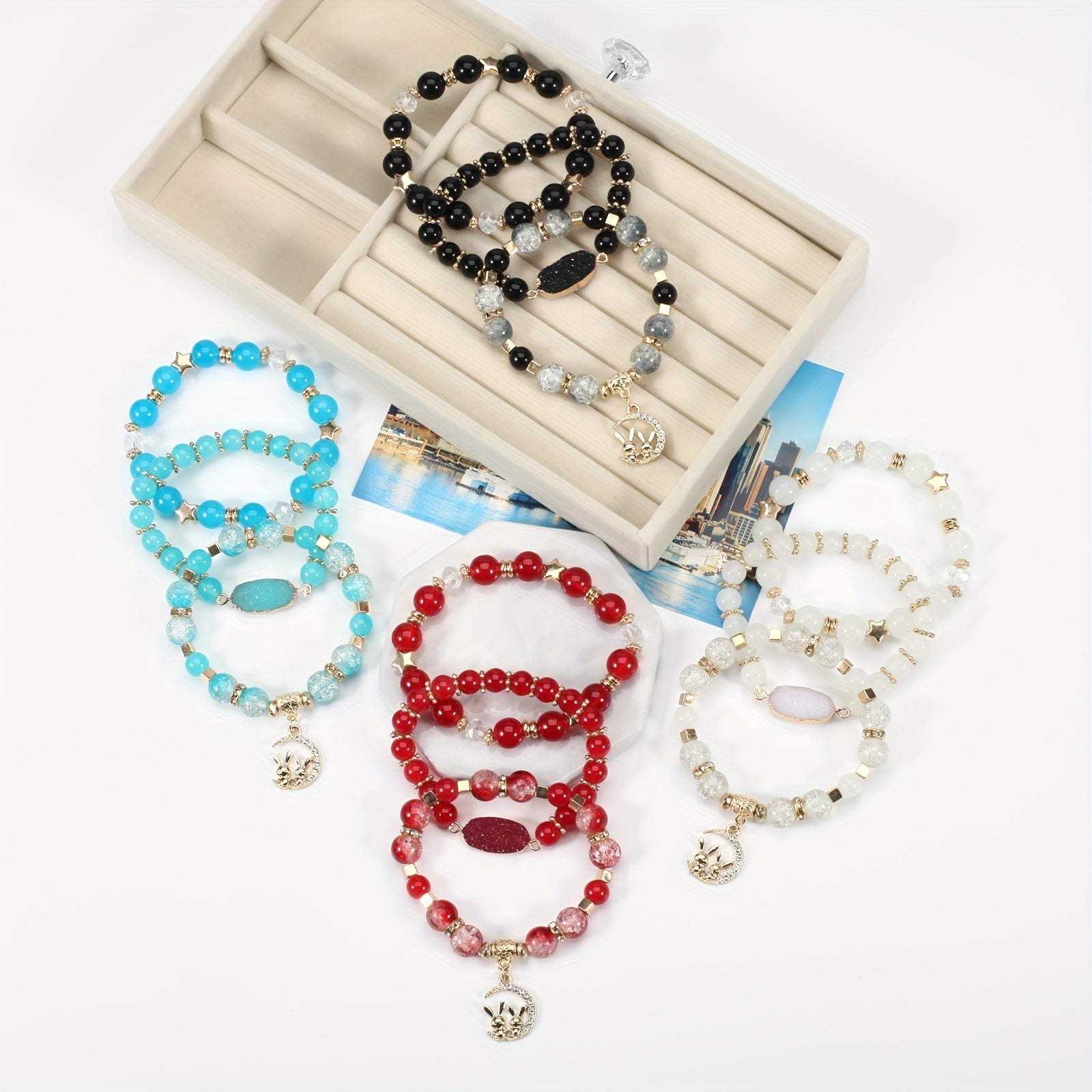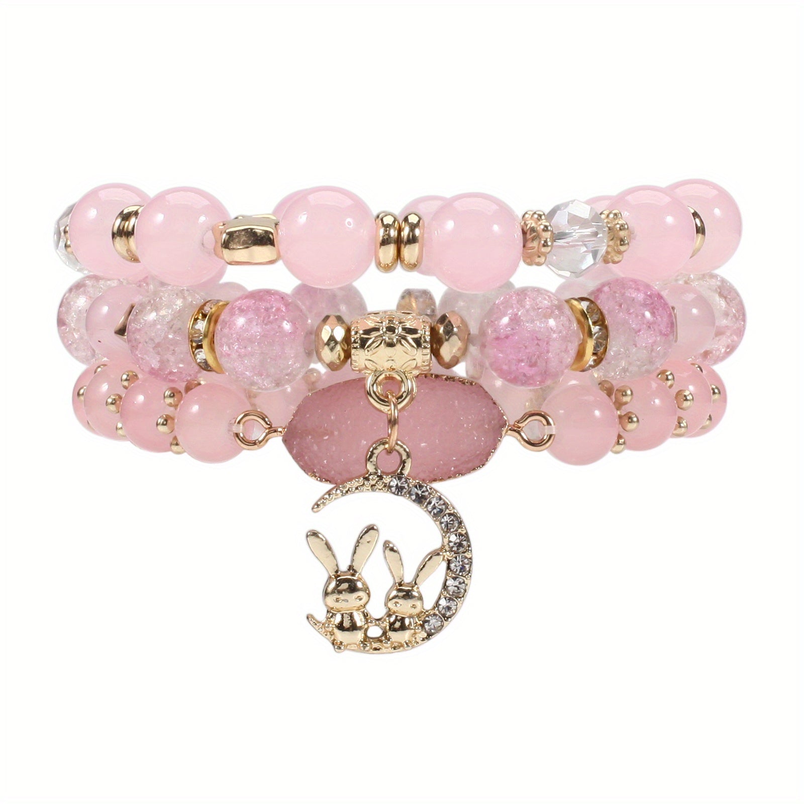 This beautiful bracelet features a rabbit and moon pendant along with colorful beads on multiple layers. It is stretchable for easy wear.