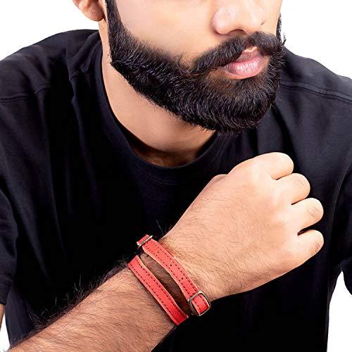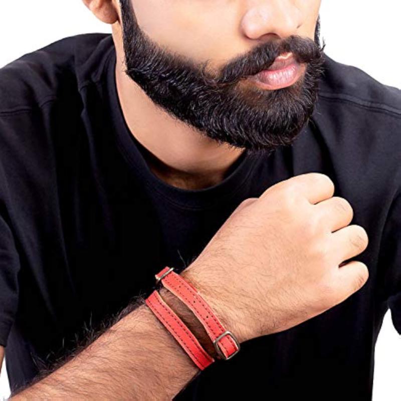 Stylish red leather bracelet featuring multiple buckles for a trendy look. Perfect accessory to complement your outfit.