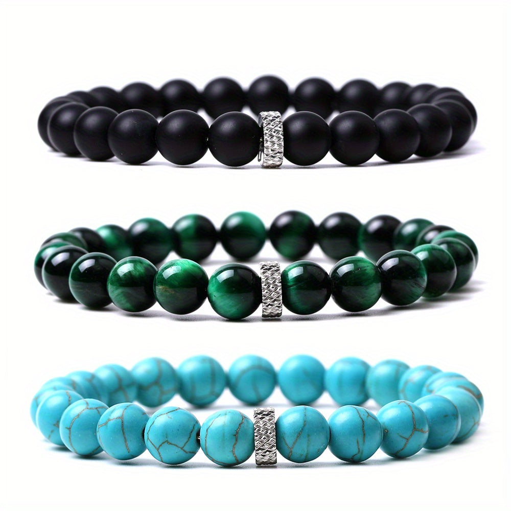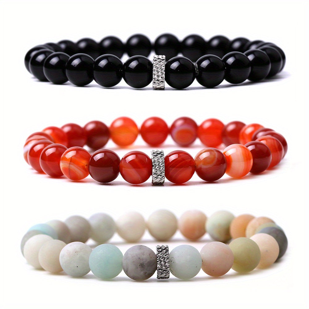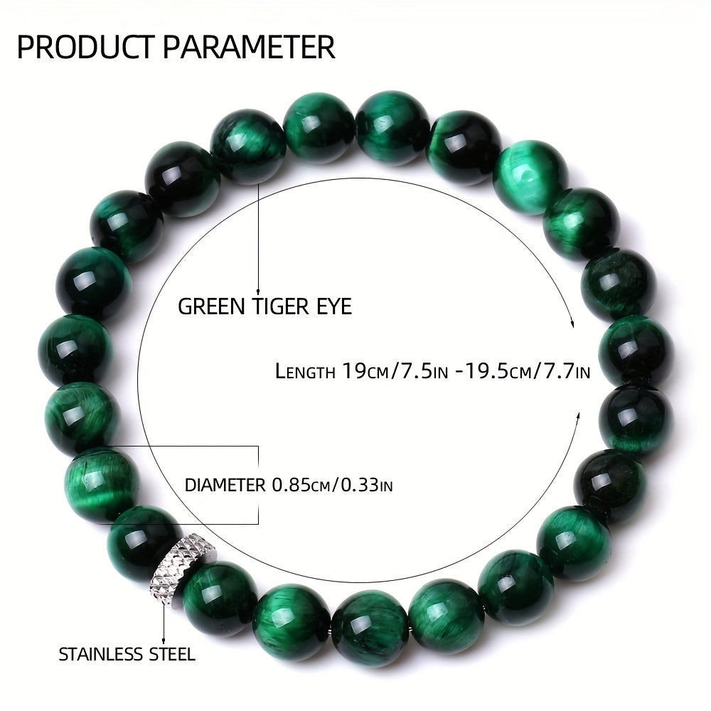 This set includes 3 bracelets made of 8mm red striped agate and green tiger eye stones. They offer healing energy and feature crystal stretch beaded bangles suitable for both men and women.