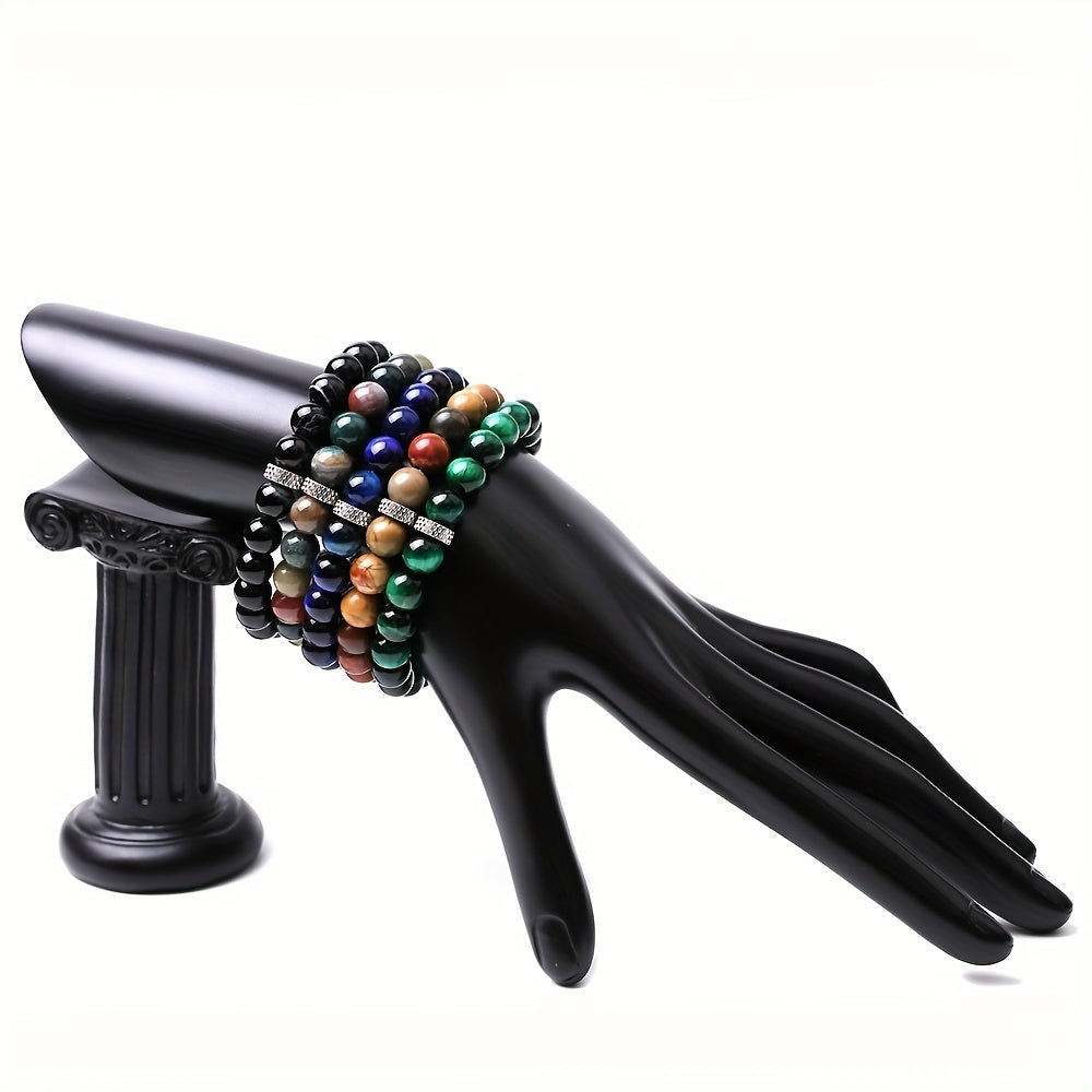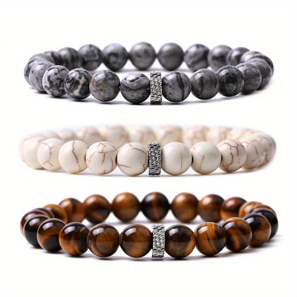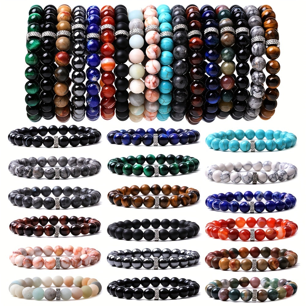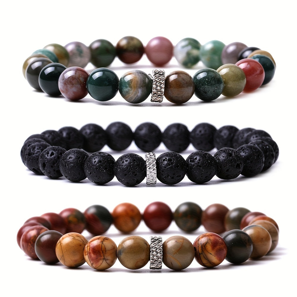 This set includes 3 bracelets made of 8mm red striped agate and green tiger eye stones. They offer healing energy and feature crystal stretch beaded bangles suitable for both men and women.