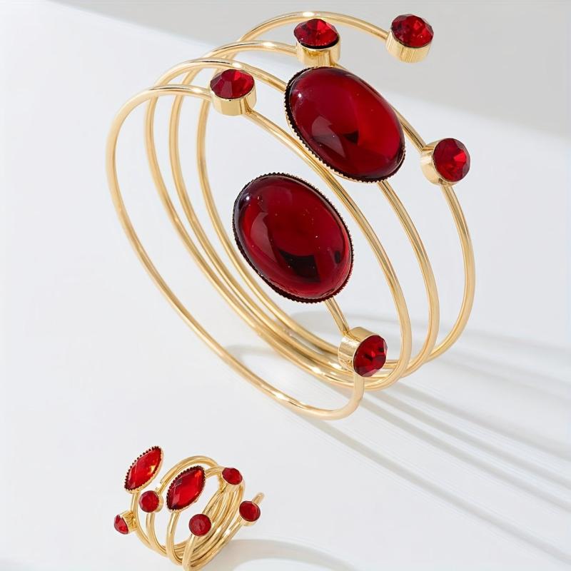 Add a touch of European and American style with this stunning red bracelet and ring set. Made with high-quality golden plated alloy, this set is perfect for daily wear and will complement any outfit.