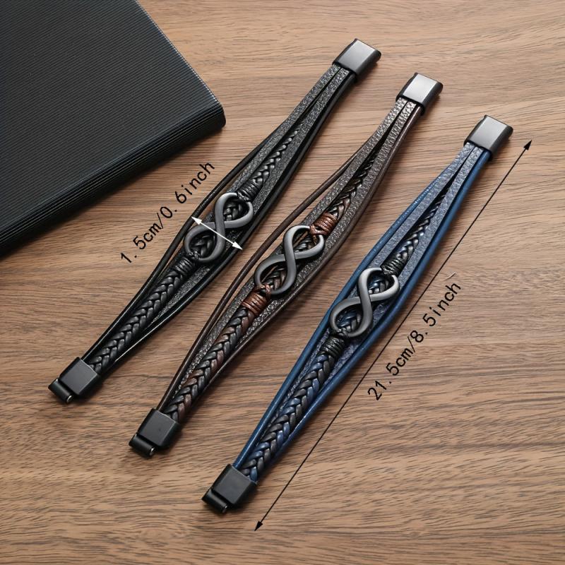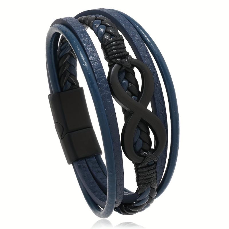 This stylish bracelet features an infinity symbol design with a magnetic clasp for easy closure. It is made of durable faux leather and comes in 4 color options.
