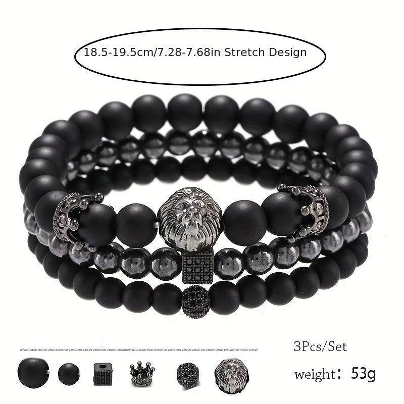 This European and American retro matte bracelet set features a unique design with crown ball, dice, and lion head bead bracelets. Perfect for adding a touch of vintage style to your outfit.