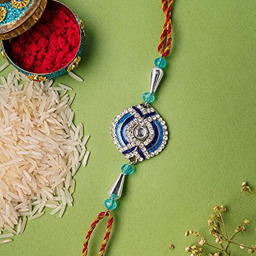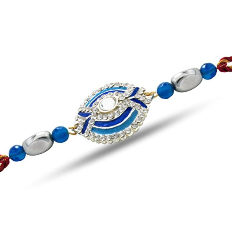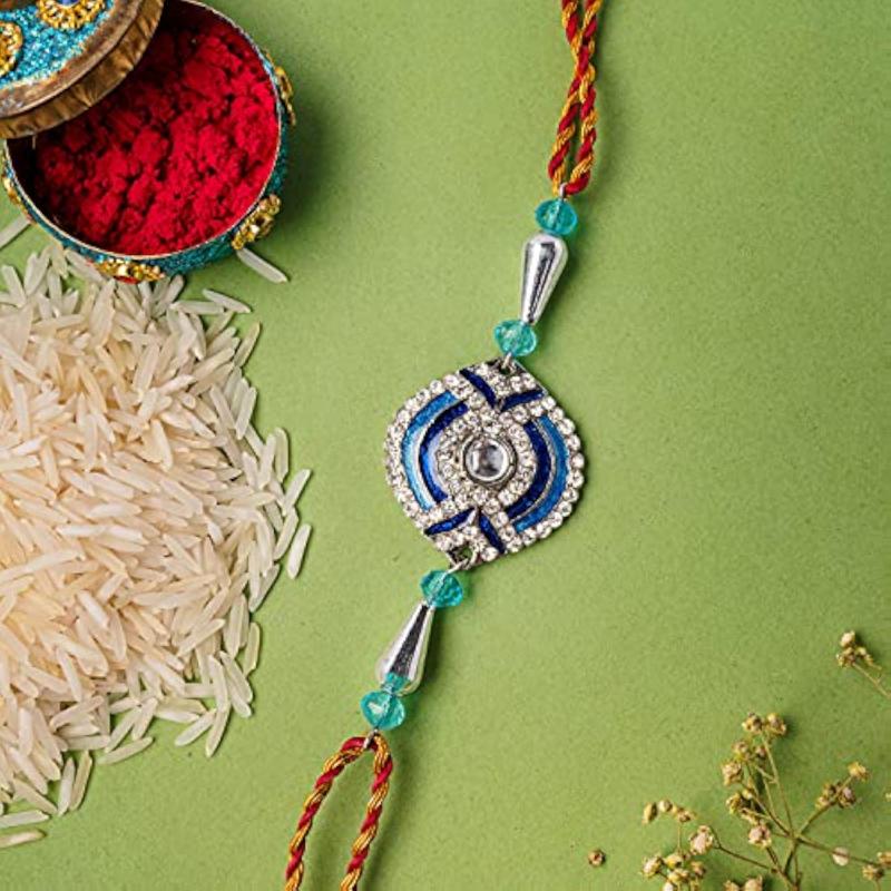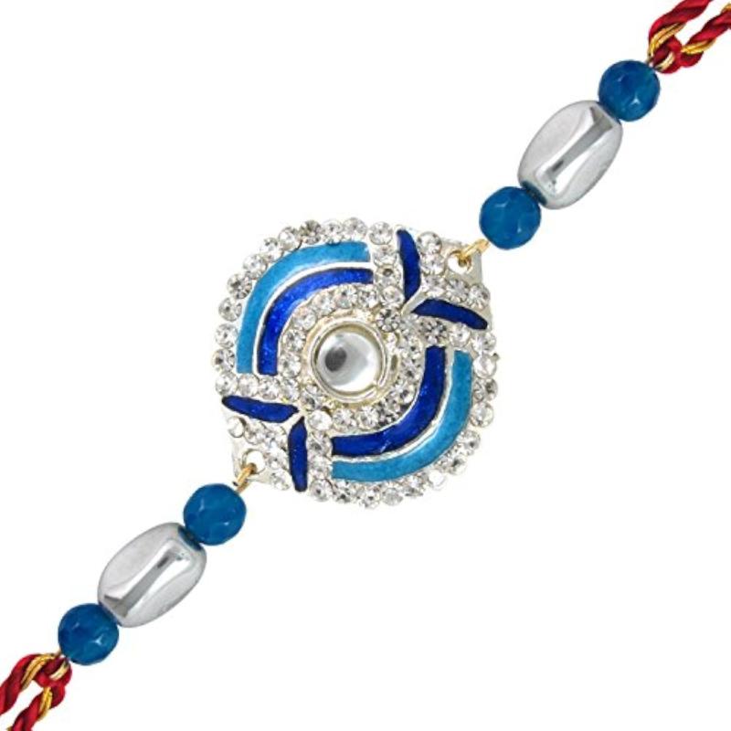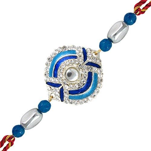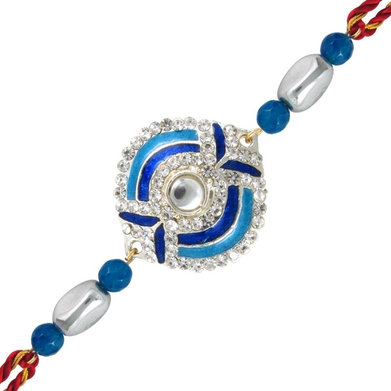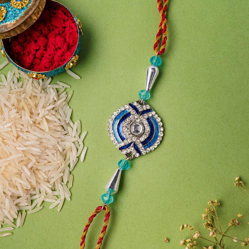 Elegant Rhodium plated Rakhi featuring azure crystals for a stunning look.