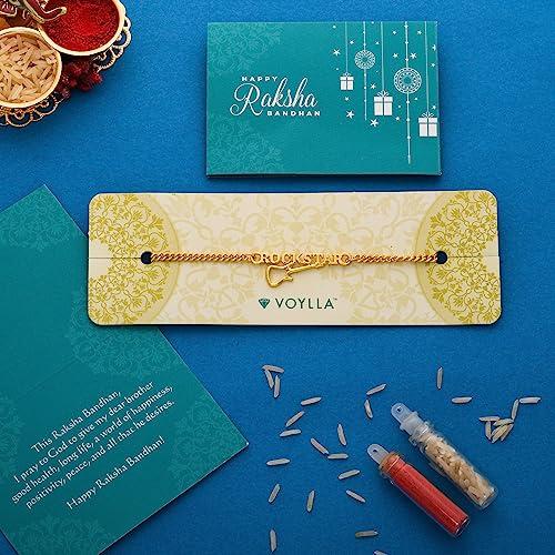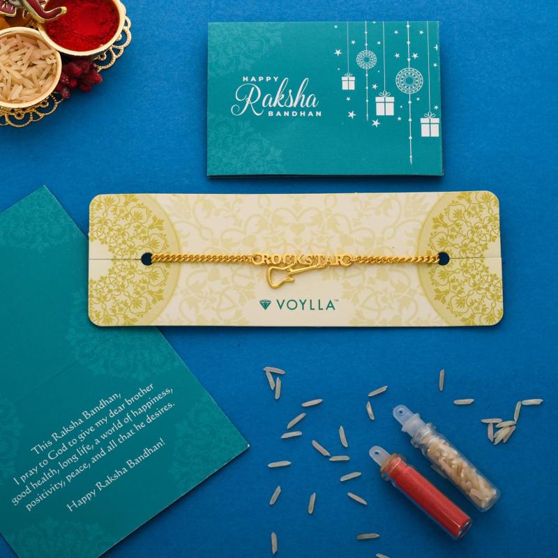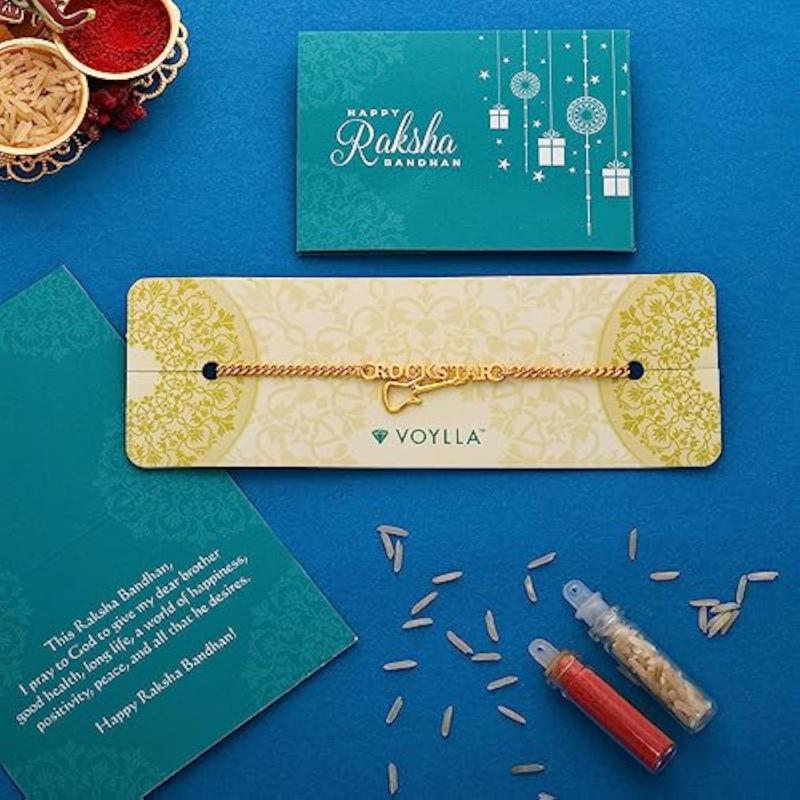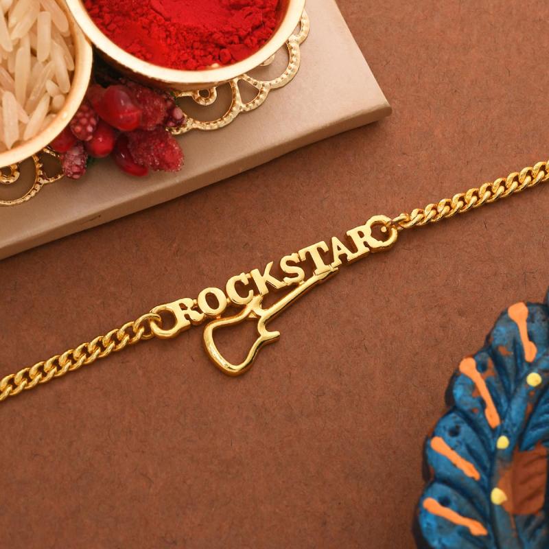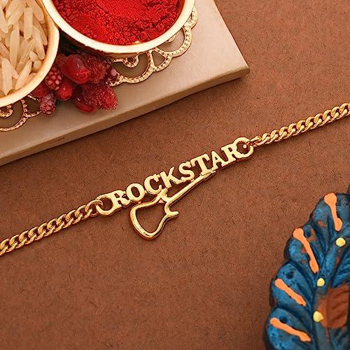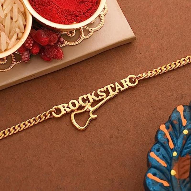 This ROCKSTAR Rakhi bracelet is a stylish and trendy accessory for your wrist. It features a unique design that stands out and adds a touch of glam to your look.
